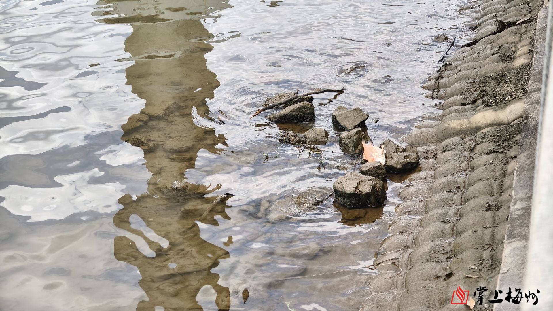 21日中午,记者来到梅城秀兰桥下归读公园亲水平台和客商中心河段码头看到,因为梅江河水位下降,亲水平台和码头周边已经形成了滩涂,在滩涂上确实有不少死鱼和生活垃圾。此外,秀兰桥下归读公园亲水平台旁的滩涂上还出现了动物尸体,在河堤上走过时都能闻到一股腥臭异味,过往的市民纷纷避而远之。