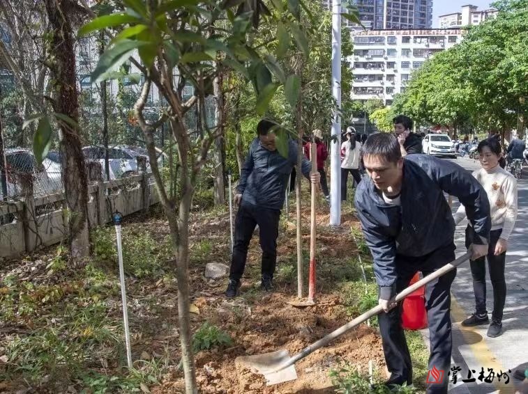 在植树现场,大家热情高涨、干劲十足,有的挥锹铲土、有的扶树正苗、有的铲土培实,分工明确、密切协作,每道工序都一丝不苟,整个场面繁忙而有序。经过一番热火朝天的劳动后,共栽下桂花、香樟等树苗140余株。一棵棵新栽种的树苗在和煦的春风中迎风挺立,焕发出蓬勃生机,为绿美梅江擦亮生态底色。