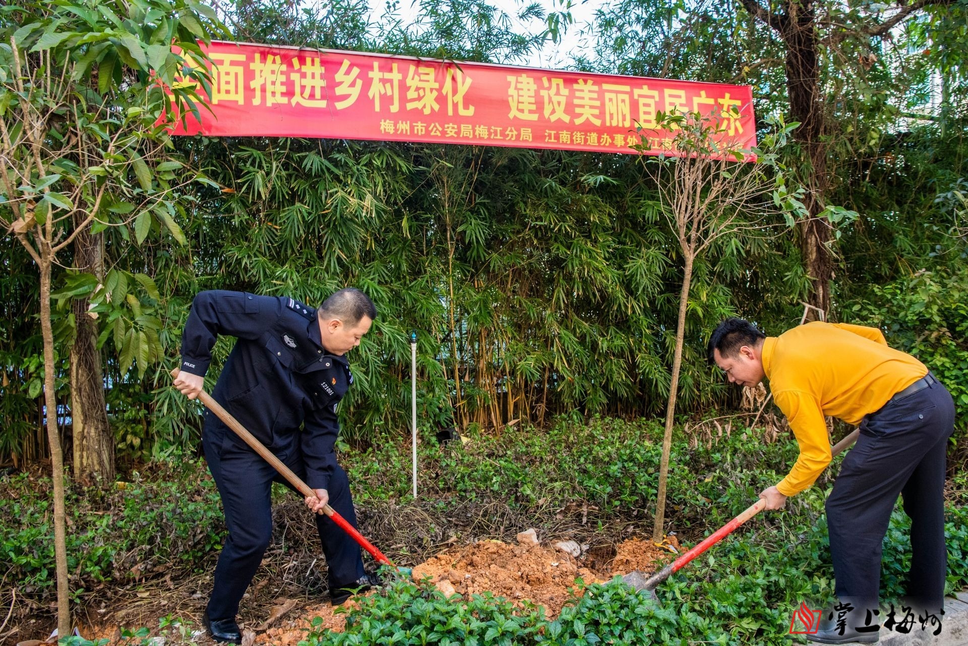 掌上梅州讯 春风拂沃野,植绿正当时。3月12日下午,梅州市公安局梅江分局联合江南街道办在红光路段开展“助力‘百千万工程’ 结对共建‘法治林’”植树活动。梅江区副区长、公安分局党委书记、局长郑荣丰,江南街道办党工委副书记、办事处主任谢文斌,江南街道办、分局班子成员,公安干警、街道办工作人员共50余人参与植树活动。