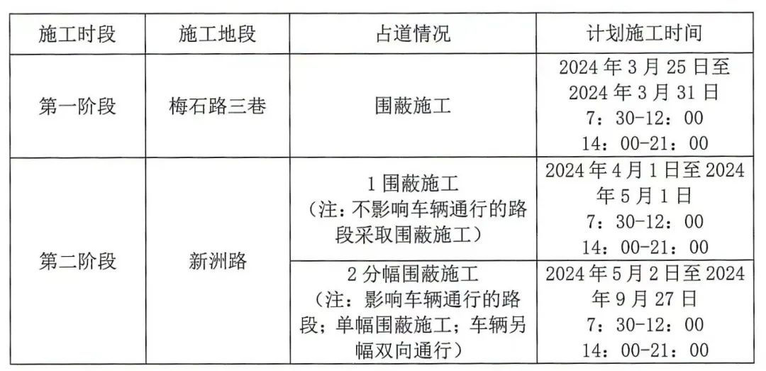此次围蔽施工分为两个阶段进行。第一阶段将对梅石路三巷进行围蔽施工,时间为2024年3月25日至2024年3月31日7:30-12:00,14:00-21:00。第二阶段将对新洲路进行围蔽施工和分幅围蔽施工,其中围蔽施工(注:不影响车辆通行的路段采取围蔽施工)时间为2024年4月1日至2024年5月1日7:30-12:00,14:00-21:00;而分幅围蔽施工(注:影响车辆通行的路段;单幅围蔽施工;车辆另幅双向通行)时间为2024年5月2日至2024年9月27日 7:30-12:00,14:00-21:00。