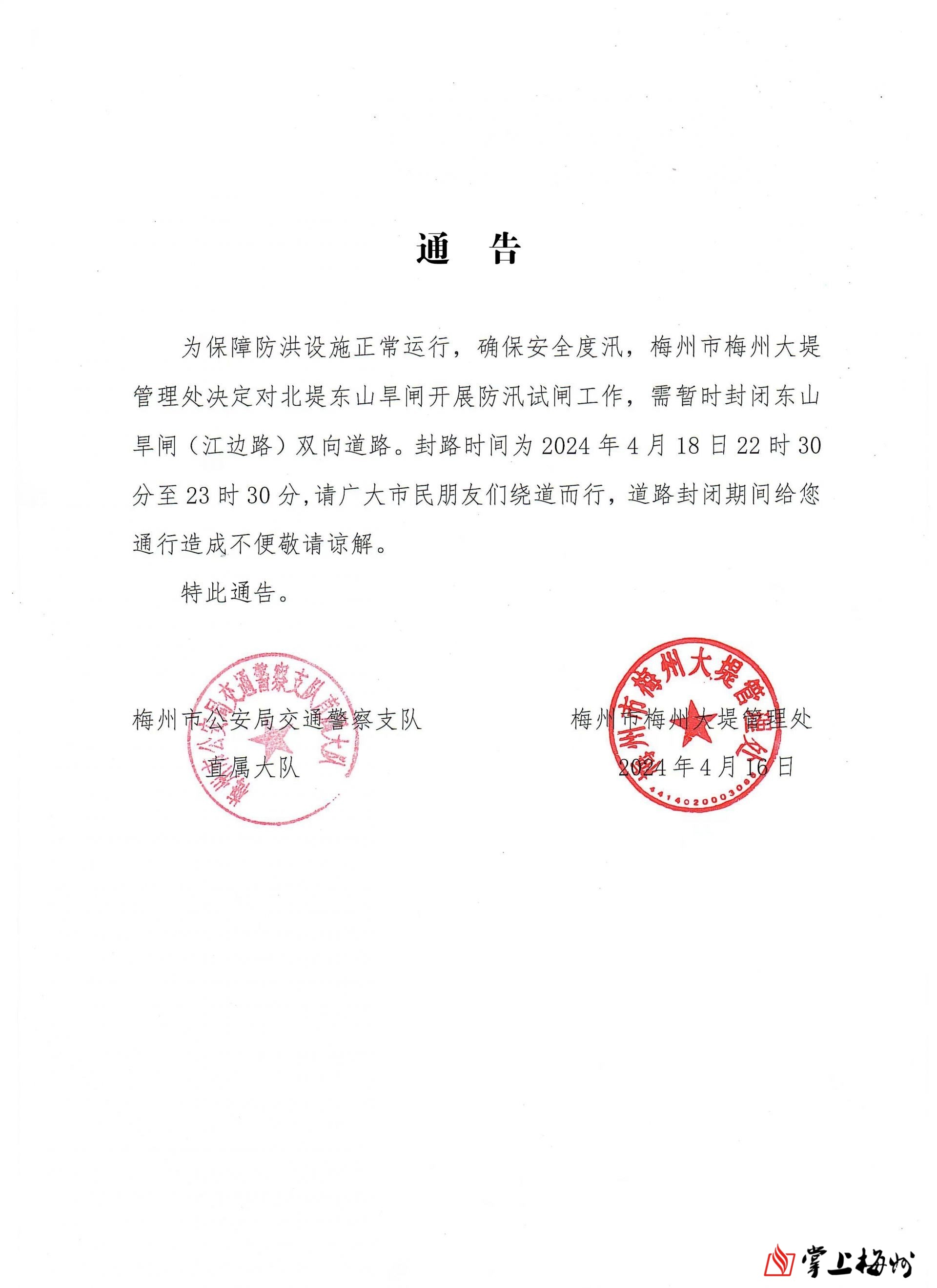 掌上梅州讯 记者从梅州市公安局交警支队直属大队和梅州市梅州大堤管理处了解到,为保障防洪设施正常运行,确保安全度汛,梅州市梅州大堤管理处决定对北堤东山旱闸开展防汛试闸工作,需暂时封闭东山旱闸(江边路)双向道路。封路时间为 2024年4月18日22时30分至23时30分。