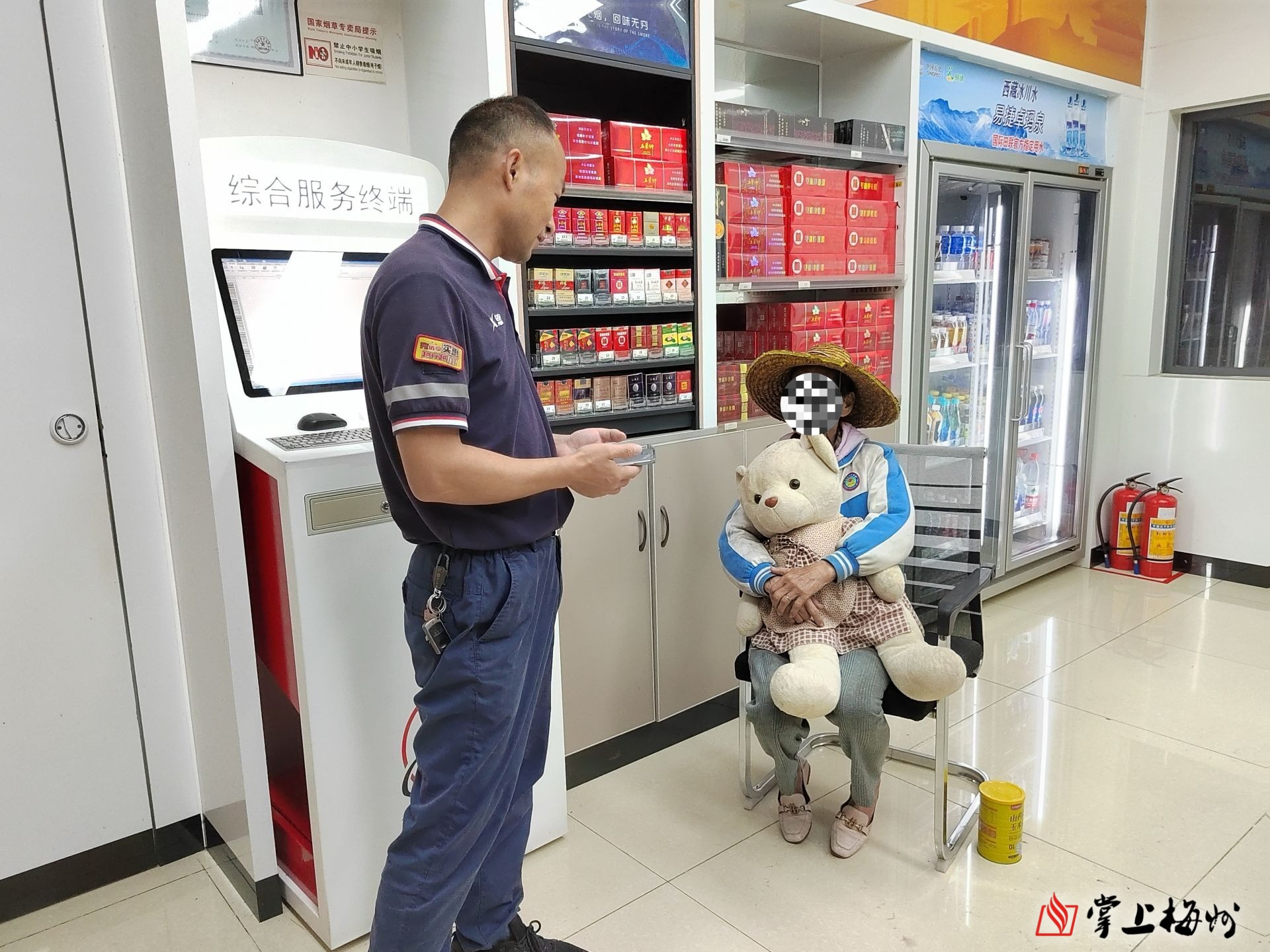 当天晚上7时,中石化平远岭南加油站外雷雨不断。突然,当班员工凌友红发现一名老奶奶正抱着一个布偶娃娃坐在加油场泵岛发呆,口中还不时呢喃。凌友红上前劝说老奶奶远离泵岛危险区域,老奶奶却置若罔闻,始终在喃喃自语。凌友红初步判断该名老人可能是意外走失,于是她迅速打电话向站长刘群生汇报情况,并报了警,随后将老奶奶扶到营业室内休息。十几分钟后,刘群生和加油站所在属地派出所民警先后赶到,民警对老奶奶进行了人脸身份识别,发现老奶奶是平远县大柘镇人,需当地派出所协助寻找家属,民警便委托加油站照看老奶奶直至家属到来。