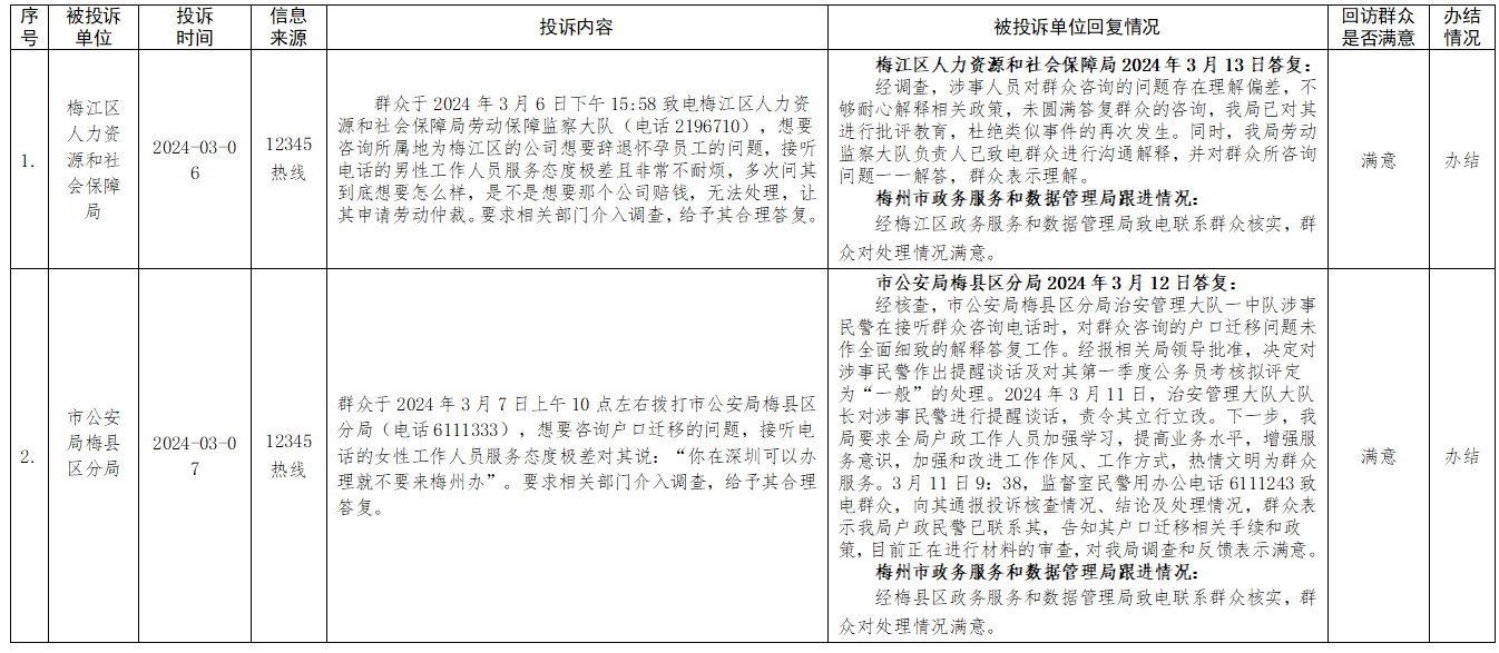 掌上梅州讯 记者从梅州市政务服务和数据管理局获悉,该局对今年第一季度我市政务服务效能情况进行了整理汇总和梳理分析,现将群众投诉整体办理情况及部分投诉件(详见下方列表)予以公布,接受社会监督。
