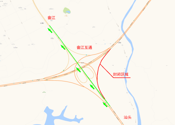 交通管制期间,汕头往梅州方向行驶的车辆,从北斗互通绕行大丰华高速。畲江互通汕头往梅州方向行驶的车辆,从畲江收费站驶出绕行G206国道。管制期间,请过往车辆按指示标志行驶,并服从公安交警、路政人员指挥,违者将依照有关法律法规处理。