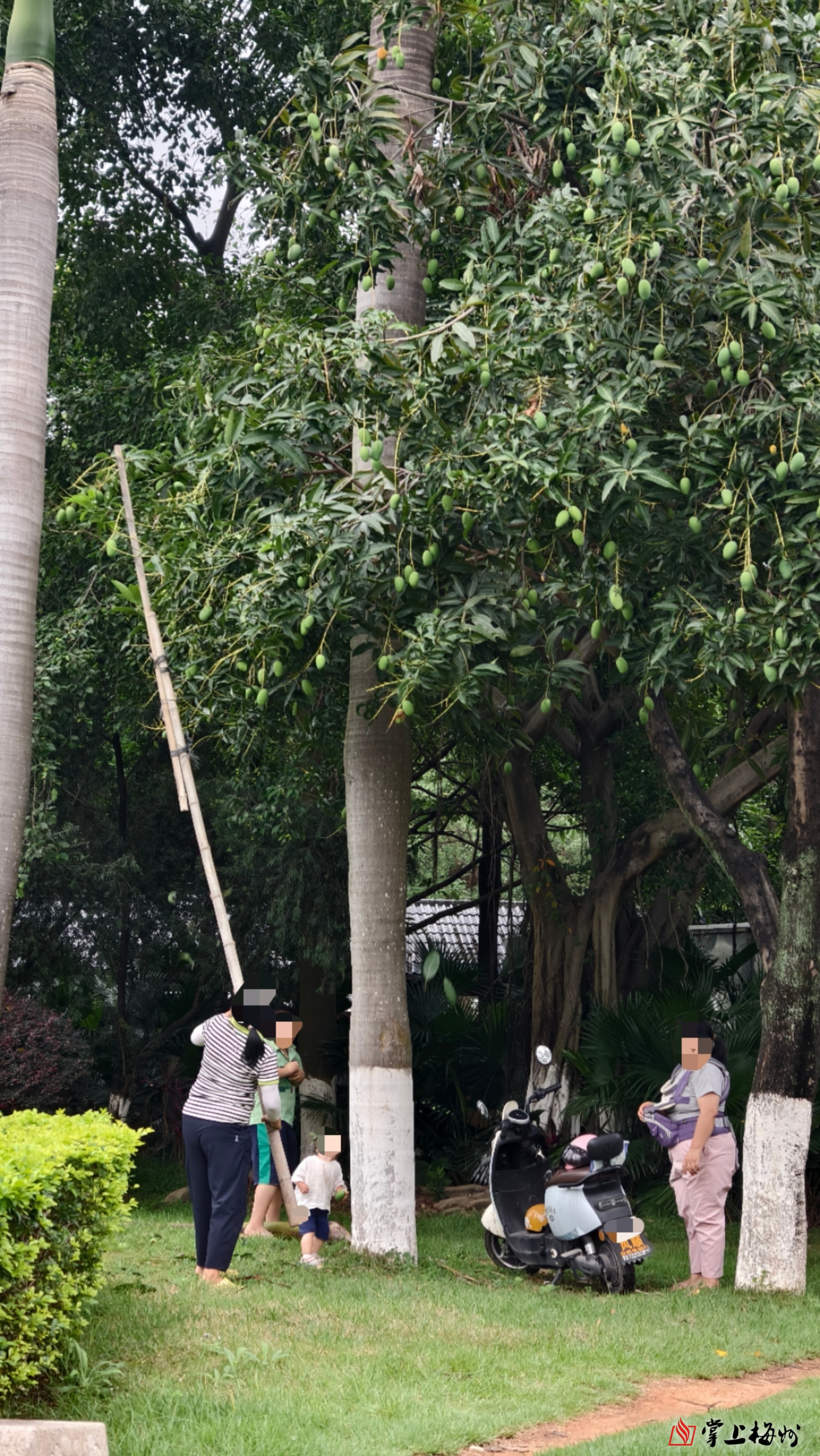 小朋友在家长的带领下,用竹竿敲打绿化芒,翠绿的树枝被打得七零八落