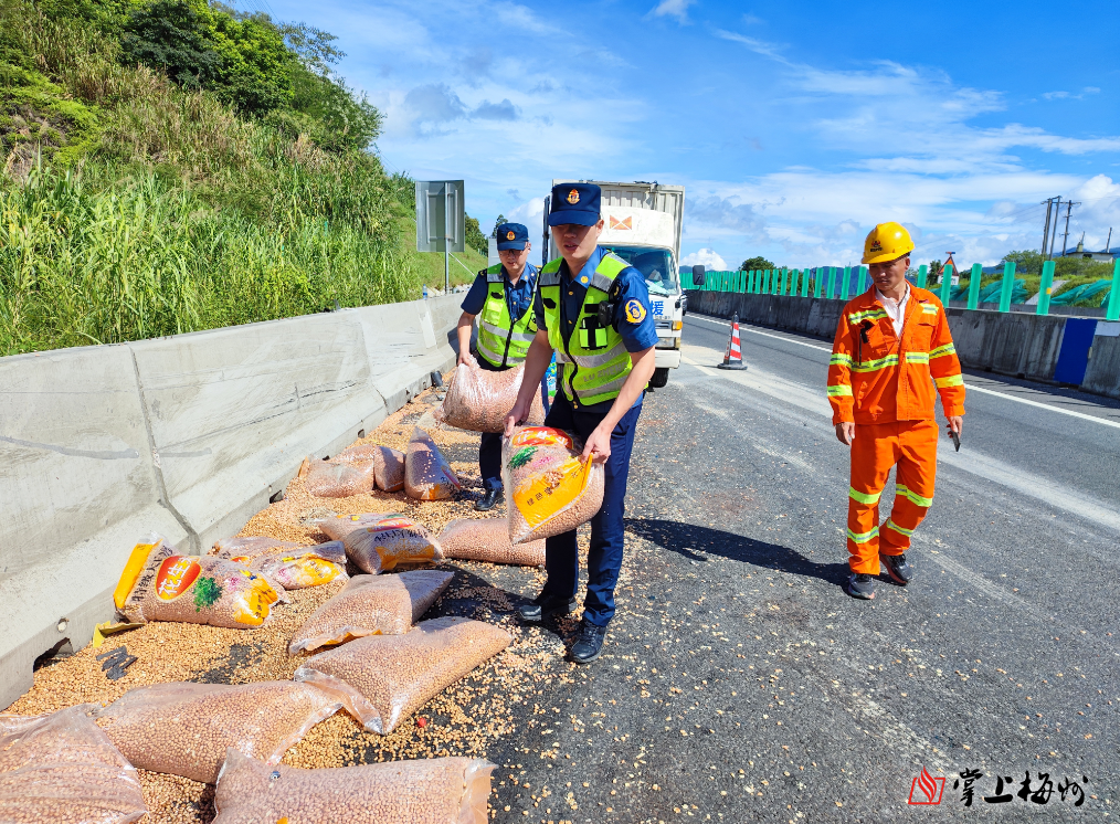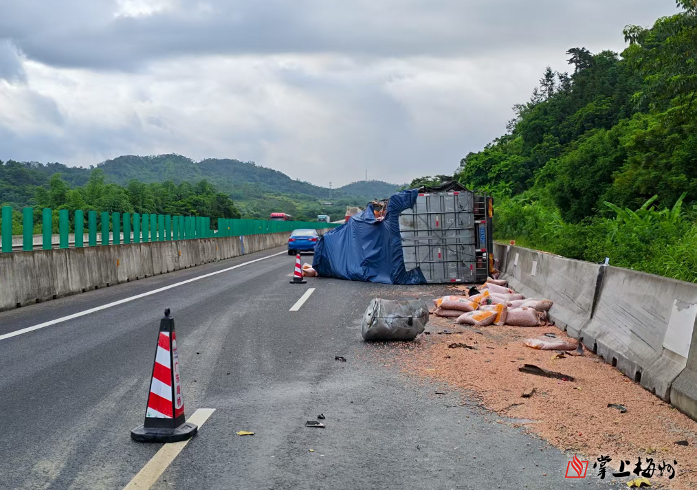 掌上梅州讯 8月18日,一辆装载近10吨花生米的两轴货车在行驶途中发生侧翻,现场下起一场“花生米雨”,广东交通集团所属汕梅高速多方联动处置,实现“颗粒归仓”。