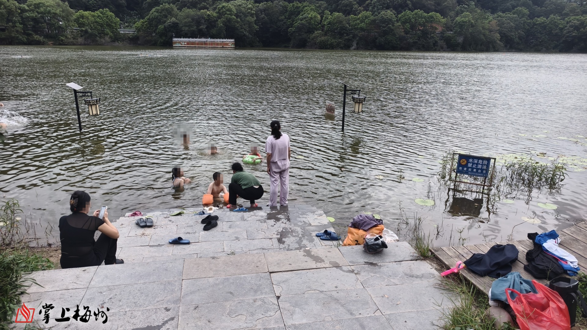 此外,景区内多个容易下水的区域,市民无视警示牌下水游泳、嬉闹的情况也屡禁不止。在泮坑水库周边,记者看到岸边竖立着“禁止下水游泳”“水深危险”等警示牌,但仍有不少市民下水游玩。其中,有家长带着孩子在浅水区嬉闹;还有几名成年男子在水库中野泳,他们身上未佩戴任何安全设备。