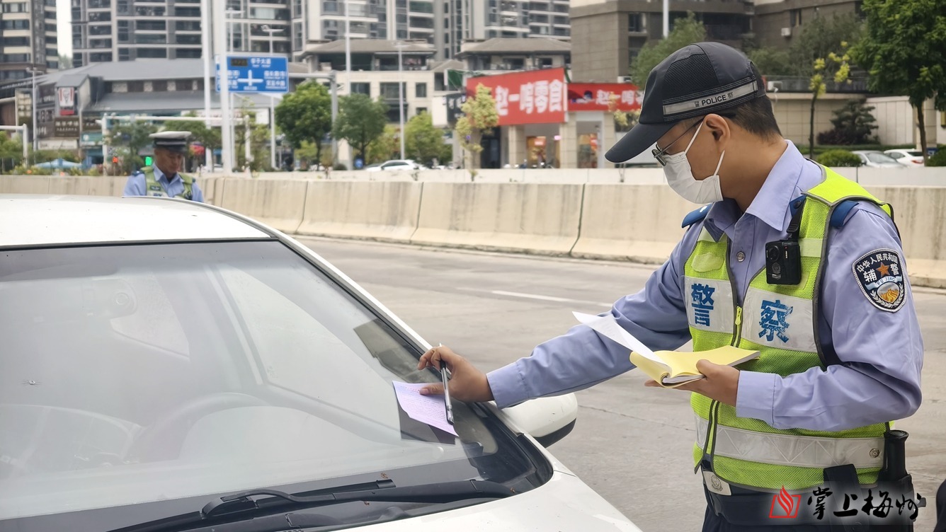 执勤民警对拒不配合驶离的违停车辆进行拍照取证,依法开具违法停放机动车告知单。