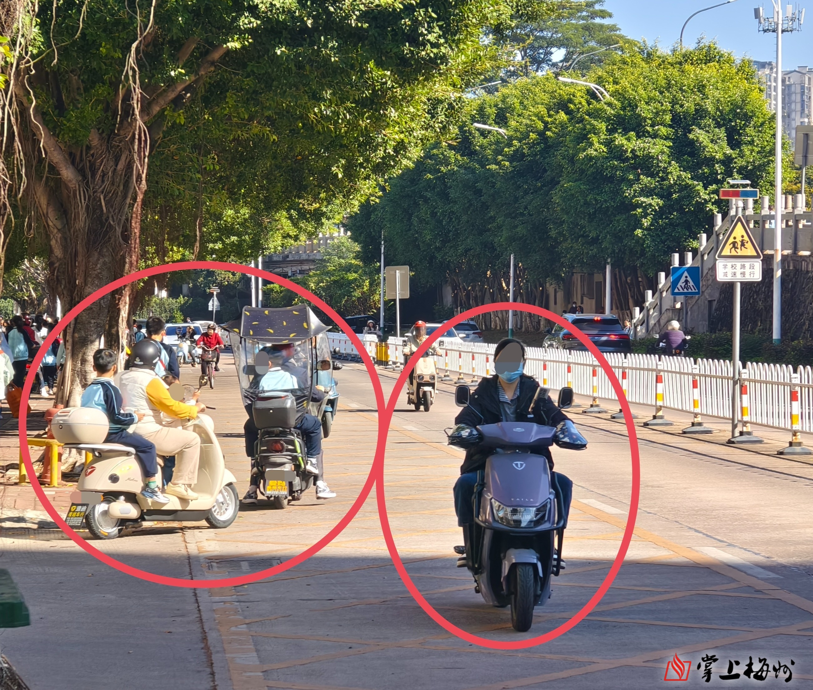 接送学生的摩托车、电动车在机动车道上逆向行驶,有些家长或学生未佩戴安全头盔。