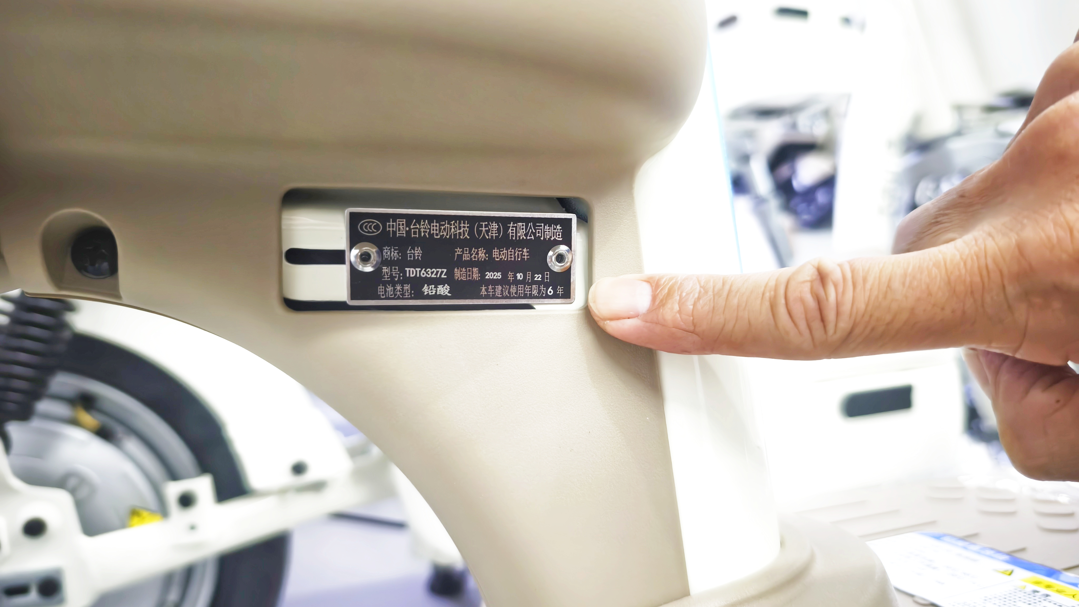 新国标电动自行车显著位置张贴着CCC认证标志和电动自行车的建议使用年限的铭牌。