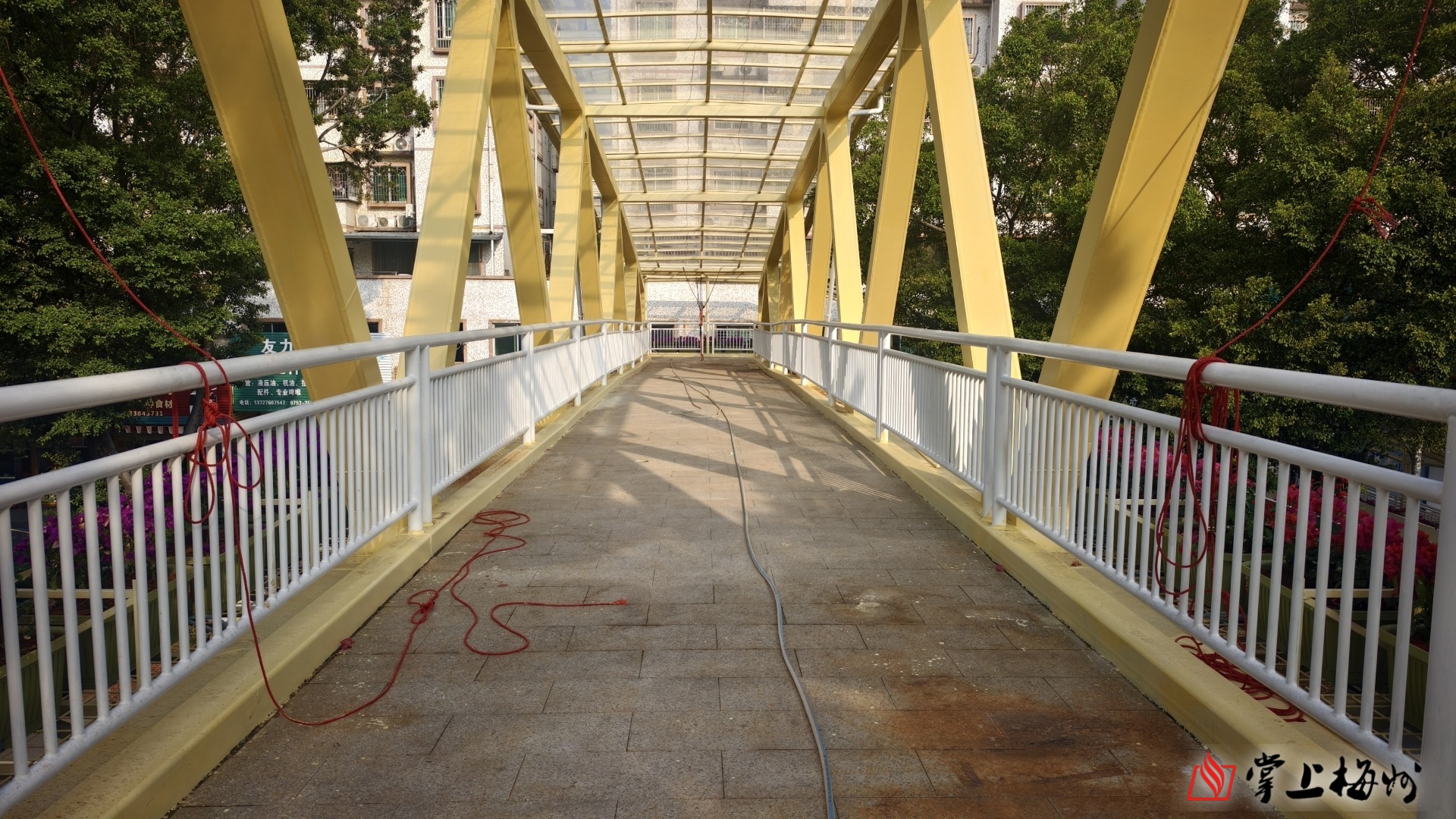 当日上午,记者在现场看到,这座横跨广梅中路的人行天桥已展露全貌:黄色的钢结构箱梁横跨马路,桥面两侧护栏整齐排列,绿化带里新栽的花草已焕发生机。但蹊跷的是,天桥两侧上桥口的铁皮围挡虽有一处被人移开了缺口,却依然写着“禁止上下”,而桥面上仍散落着施工绳索等工具,与周边整洁的环境形成反差。