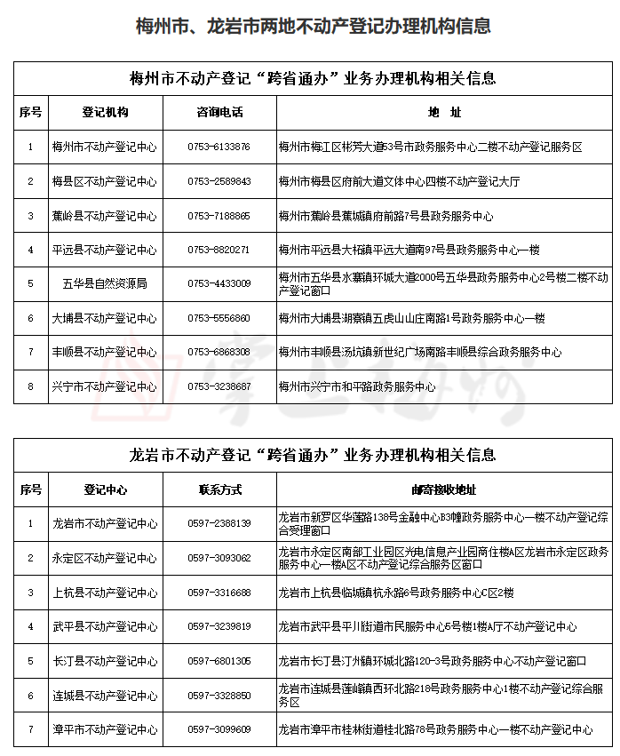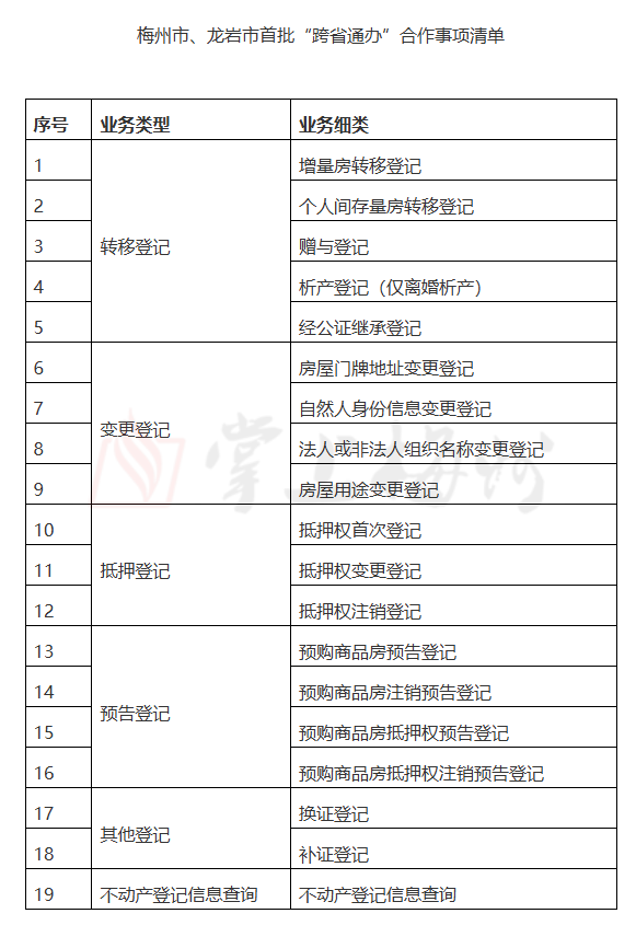 现阶段龙岩、梅州两地优先将不动产登记信息查询、二手房转移登记、抵押登记、预告登记等高频业务纳入首批“跨省通办”办事范围。