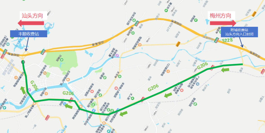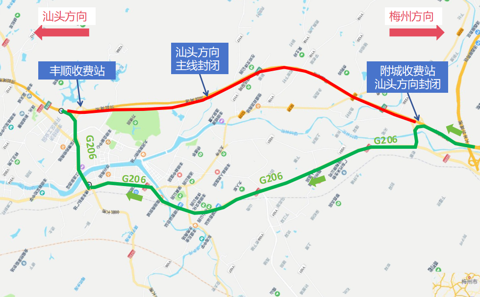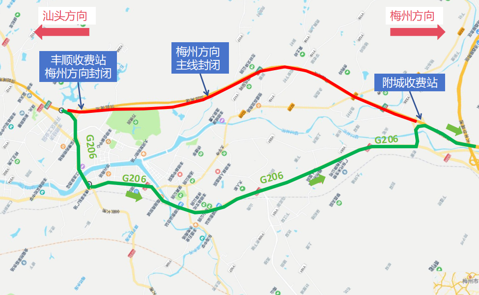 梅州往汕头方向行驶的车辆,从附城收费站驶出,绕行G206国道至丰顺收费站重新进入高速。