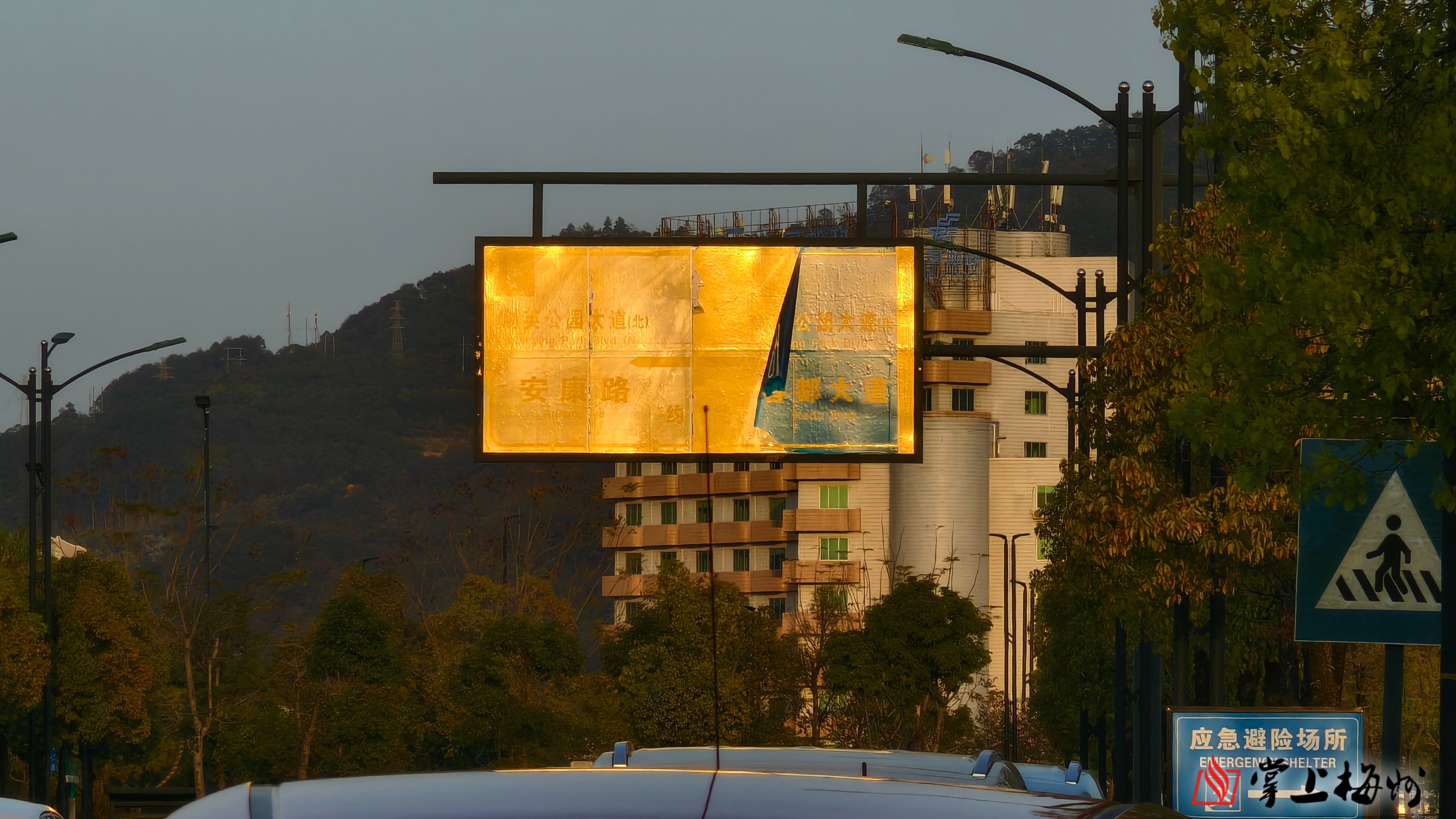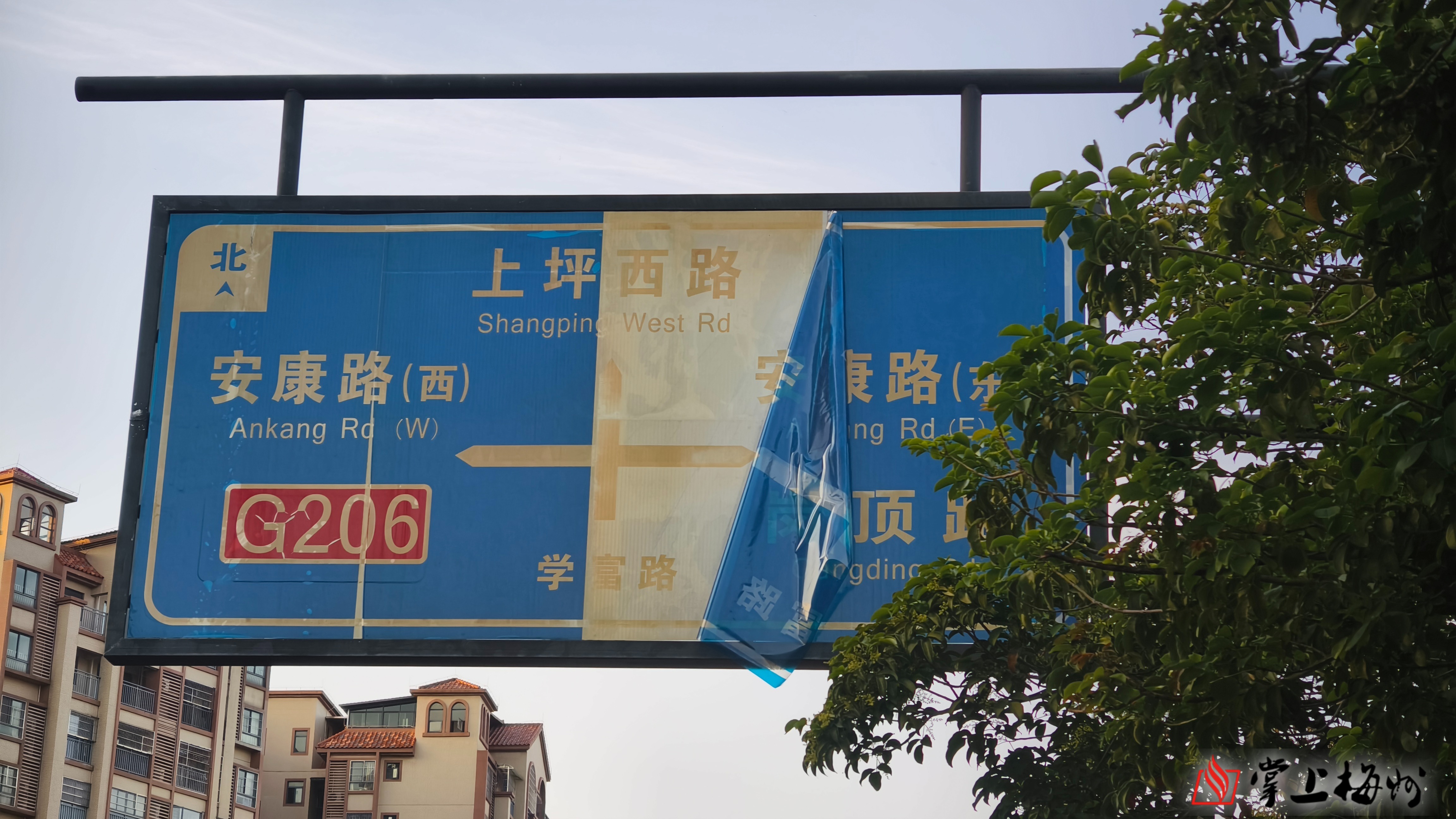 学富路一块设置在路口的路牌蓝色胶面脱落近四分之一,“学富路”“上坪西路”“安康路”字样残缺不全。