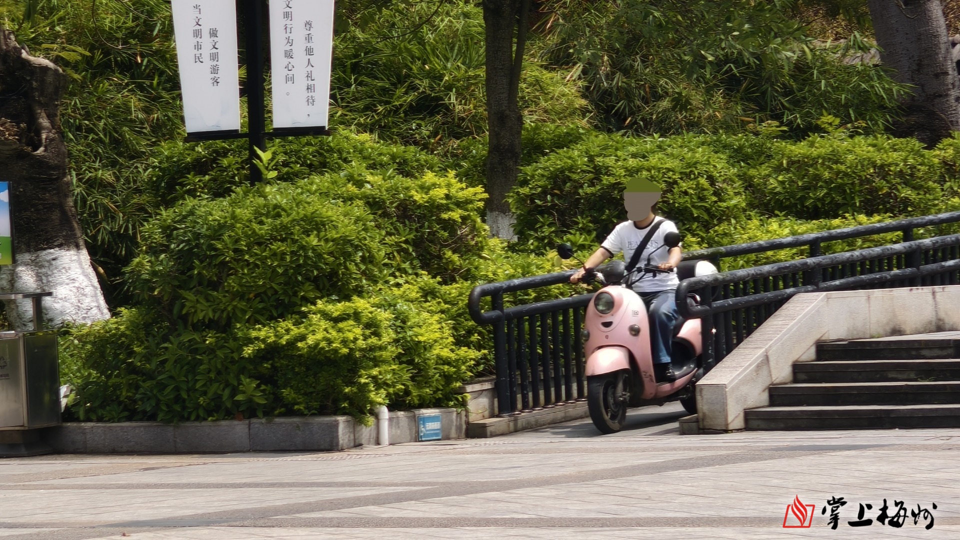交通乱象同样影响出游体验。在客家公园,公园出入口等显眼位置悬挂着“禁止所有车辆入园”的警示标识,但不少市民依然骑着电动车和自行车进入园内游玩。在剑英公园旁的如意路、泮坑大道等严管路段,部分车主无视“违停罚款”警示牌,将车辆停放在非停车区域、斑马线甚至新能源汽车充电车位,严重影响道路通行秩序。
