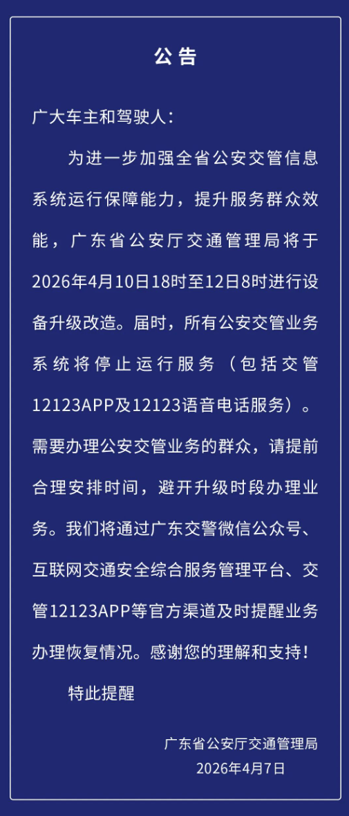 掌上梅州讯 4月8日,记者从“广东交警”微信公众号了解到,为进一步加强全省公安交管信息系统运行保障能力,提升服务群众效能,广东省公安厅交通管理局将于2026年4月10日18时至12日8时进行设备升级改造。