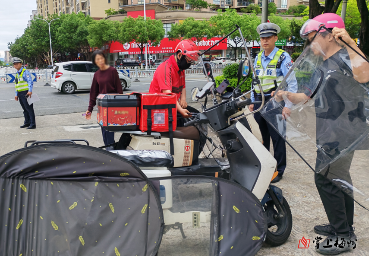 交警责令驾驶员将加装遮阳棚的电动自行车恢复原状,确保行驶安全。