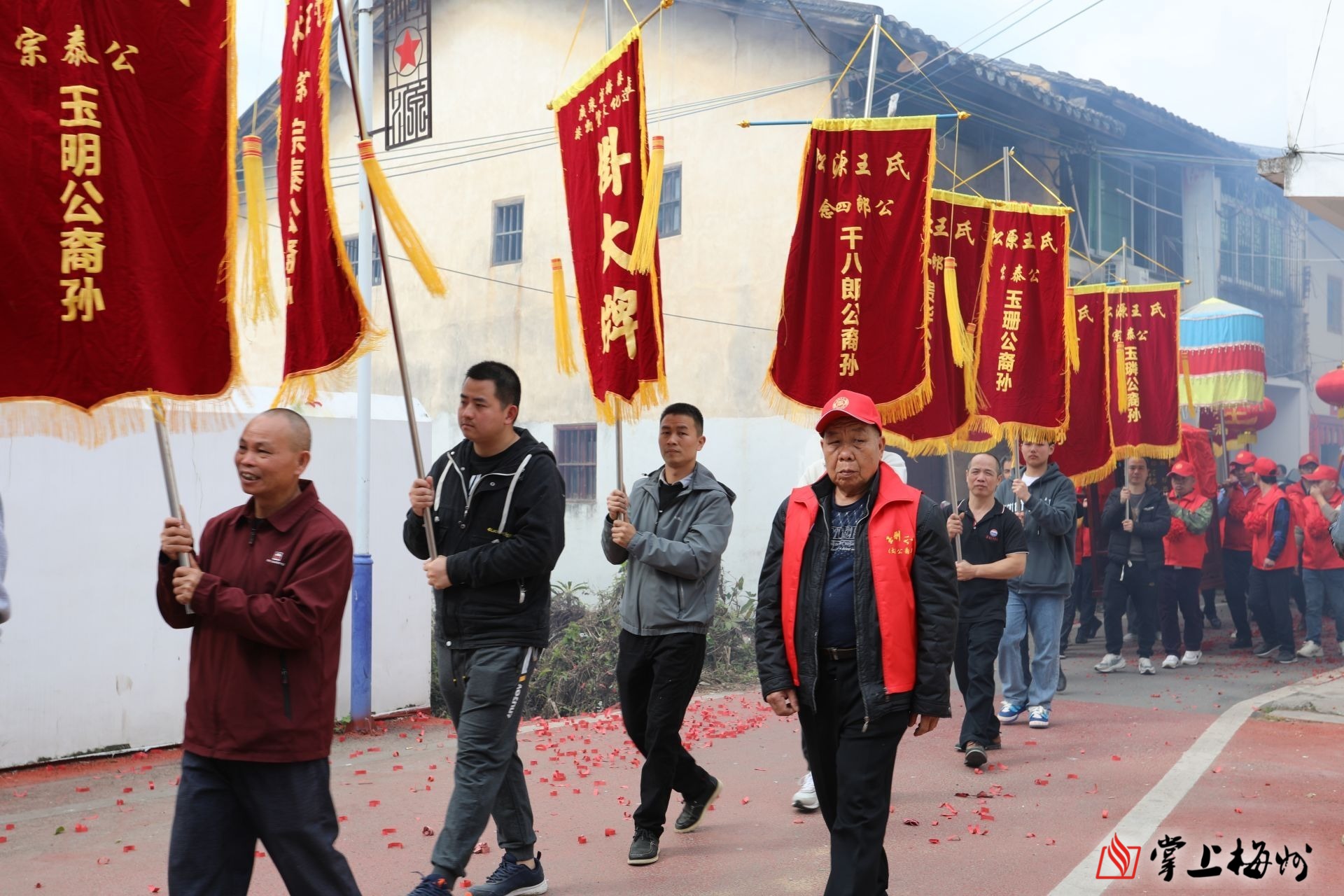 上午八时,参加“挂大牌”活动的各路队伍分别从各自的祠堂出发,到松源中学足球场集中举行交、接牌仪式。随后,在松源镇主要街、村道进行巡游,整个圩镇人声鼎沸、锣鼓喧天,巡游队伍彩旗飘飘、浩浩荡荡。巡游结束后,在径口村接牌房举行迎牌的祭拜仪式。“我觉得这样的活动很有意义,既传承了良好的家风,又可以增加家族凝聚力,加深彼此间的感情。”从广州市增城区回来的王氏后裔王导奇说。
