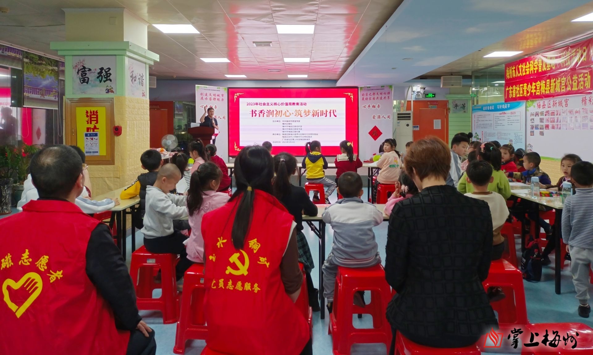掌上梅州讯 3月3日晚,梅县区新城办富贵社区在梅县新城宫举行“书香润初心·筑梦新时代”——社会主义核心价值观主题实践活动,吸引了不少家长带着小朋友参加。