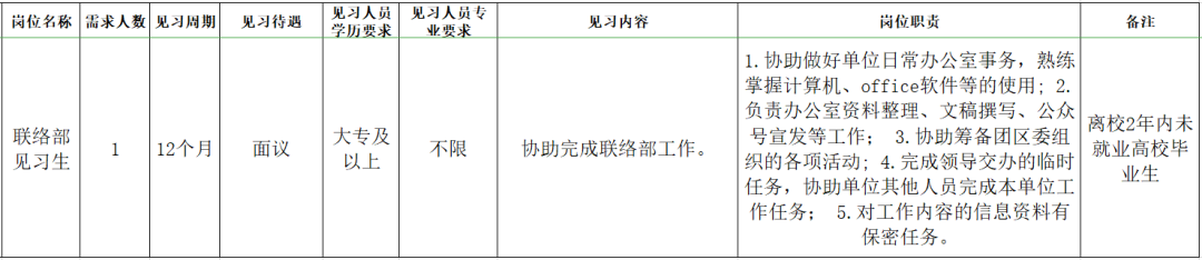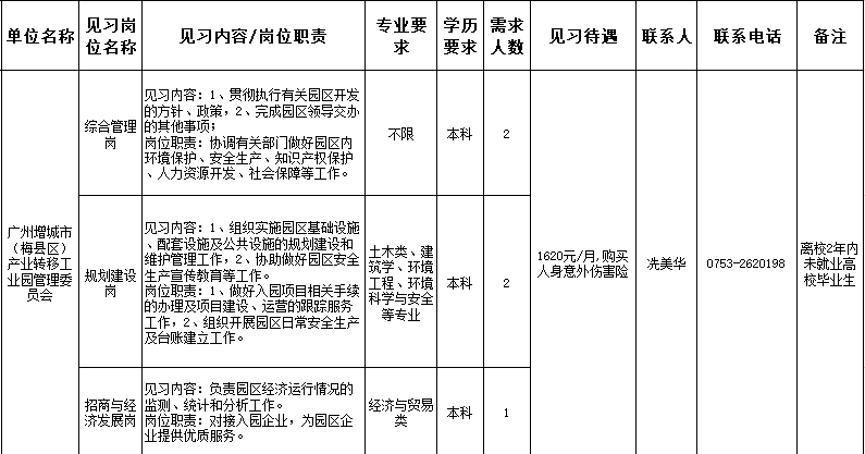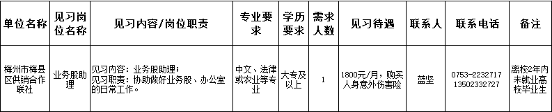 为贯彻落实《梅州市实施“青梅计划”集聚优秀青年人才的若干措施》的通知精神,根据《梅州市建立高校毕业生就业见习基地实施方案》(梅市人社[2011]209号)和《关于进一步加强就业见习工作的通知》(梅市人社函[2019]153号)精神,有效促进青年实现就业,帮助毕业2年内高校毕业生和失业青年提升综合素质和职业能力,推动其最大限度就业,团区委、区民政和人社局联合多家单位现面向社会招募就业见习人员。