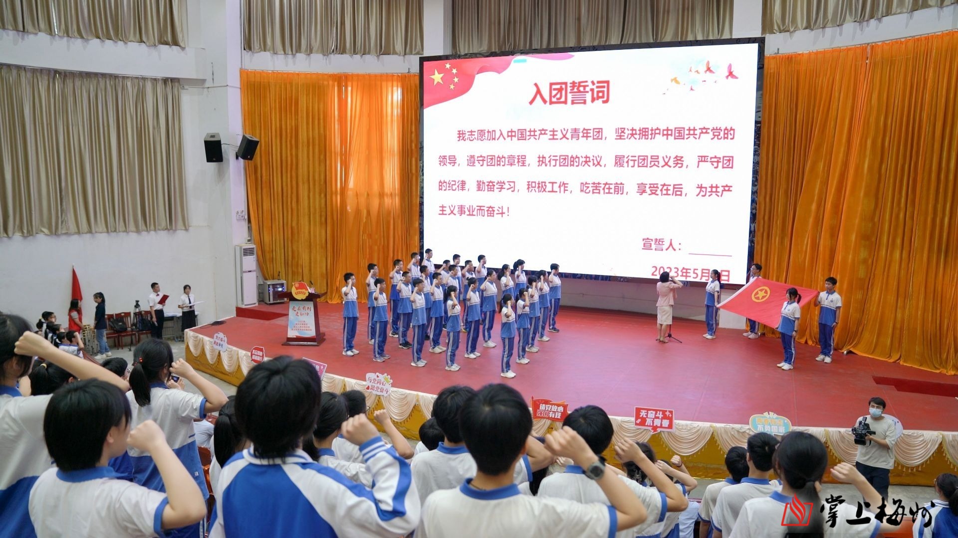 活动在雄壮的国歌声中拉开序幕。仪式上,年满14周岁的少先队员们在《中国少年先锋队队歌》声中光荣离队,与会领导嘉宾为他们佩戴团徽、颁发团员证、《团章》 ,新团员们用最饱满的精神状态向团旗庄严宣誓,正式加入中国共产主义青年团。随后,举行法制教育进校园宣讲,来自梅县区人民检察院的干警辜颖珊为大家带来《规范使用网络,共护清朗空间》的讲座。