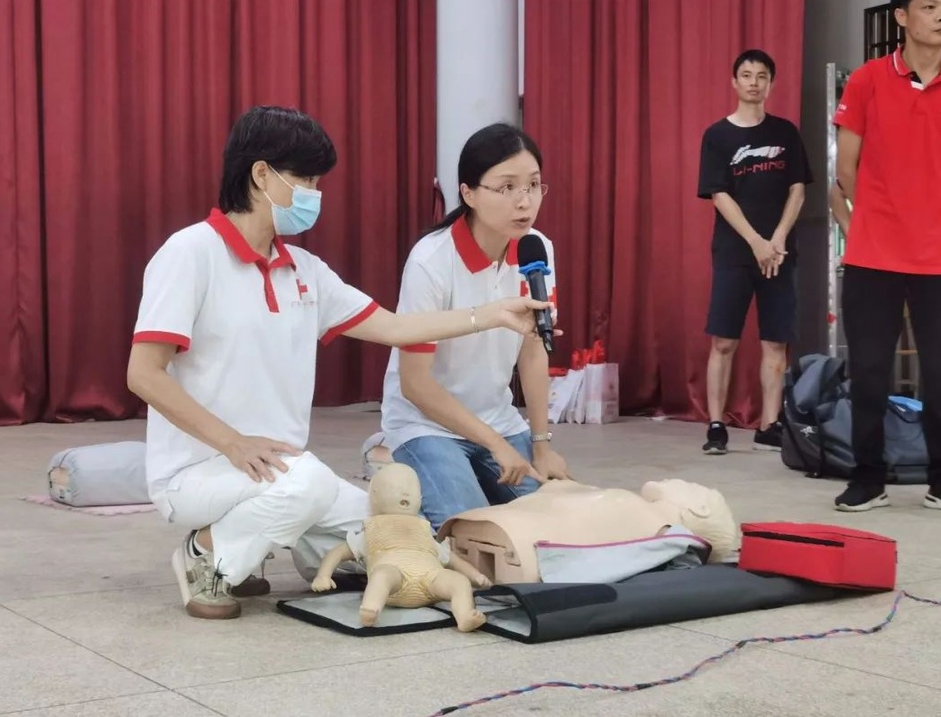 嘉应学院医学院老师现场讲授了红十字运动基本知识、心搏骤停、现场心肺复苏术、自动体外除颤仪使用、常见急症的预防和现场急救等群众性现场应急救护知识技能以及传染病防控知识等。主讲老师用专业的理论知识和典型的实际案例,重点讲解正确拨打120急救电话、心肺复苏黄金四分钟、心肺复苏的操作步骤和注意事项等知识,并通过模拟人体示范演示和实际操作增强学习效果。现场学习气氛热烈,师生互动效果良好。