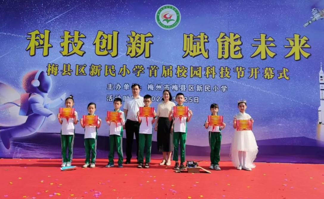 5月25日,梅县区新民小学开展了“科技创新 赋能未来”为主题的首届校园科技节活动。本次活动形式多样,设置了机器人舞蹈表演、科学魔术秀表演、航模和无人机花式表演等多个项目。在教师的策划和学生的参与下,学校收到了科技作品400多份,评选出优秀作品241份,并遴选出科技之星7名。