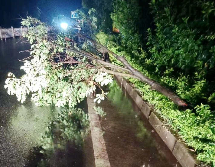 △6月17日早上8点,一夜大雨过后,白渡组组长章强巡查发现国道205线白渡觉慈段有路树倒下,立即进行锯树作业并清理。作业中不幸伤及脚趾,但安全隐患得以消除。