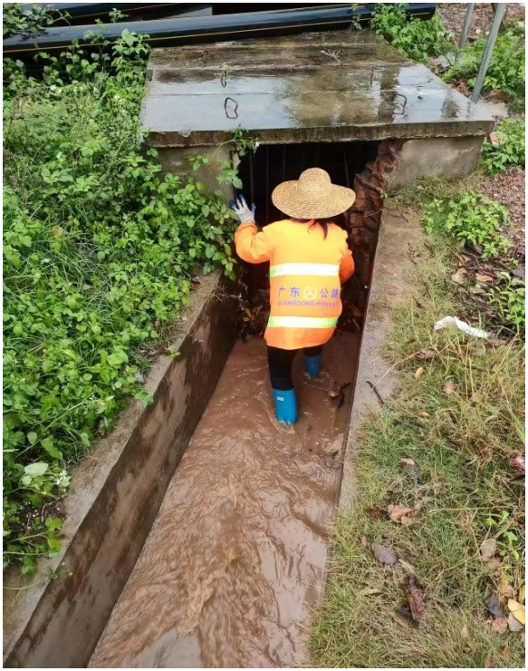 △6月17日下午5点,竹洋组扫路车清扫路面,组织人员疏通排水沟。