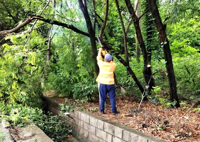 △6月17日下午4点,水车组沿路修砍垂下的竹子,清理路面和水沟杂物。