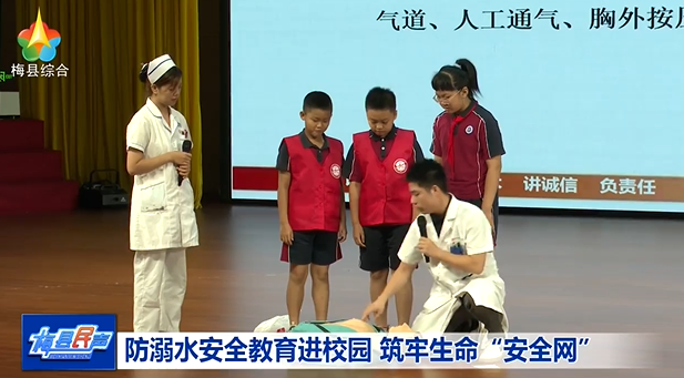 在梅州市外语实验学校的礼堂,民警通过播放PPT、视频等方式,从如何预防溺水、如何正确自救、如何正确施救三个方面,向学生讲授防溺水安全知识;梅州铁炉桥医院的医生则向学生们传授防溺水急救措施,并邀请学生上台进行心肺复苏演习。通过上这场防溺水安全课,学生们受益良多。