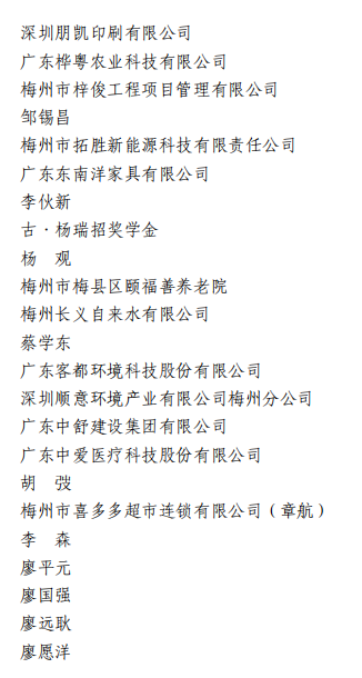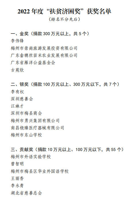 为树立典型,弘扬善举,进一步推动梅县区深入开展“6·30”助力乡村振兴活动,根据《梅县区2023年“6·30”助力乡村振兴活动工作方案》,经各镇(高管会、办事处)和各单位的推荐、评审,区委实施乡村振兴战略领导小组决定,对李伟锋先生等个人、单位授予“2022年度扶贫济困金奖”;对李有权先生等个人、单位授予“2022年度扶贫济困银奖”;对梅州市外语实验学校等单位、个人授予“2022年度扶贫济困贡献奖”。
