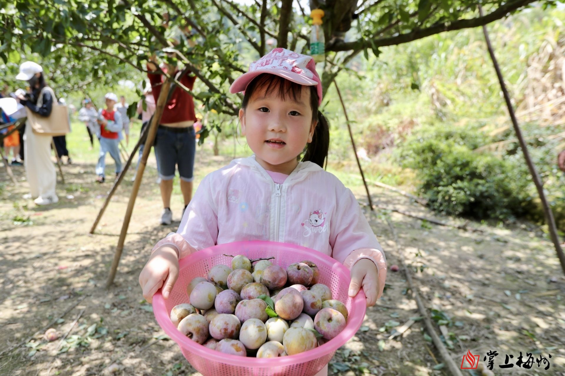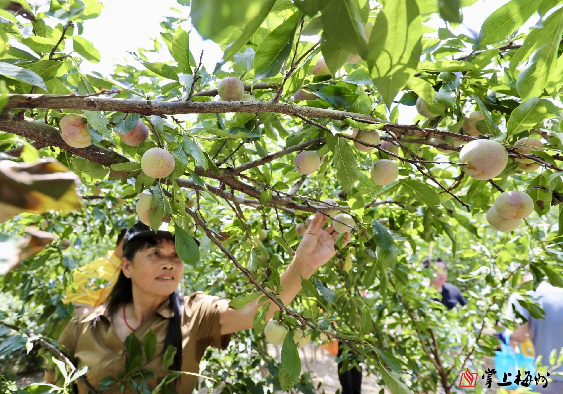 游客在果园采摘石坑奈李,体验采摘乐趣。