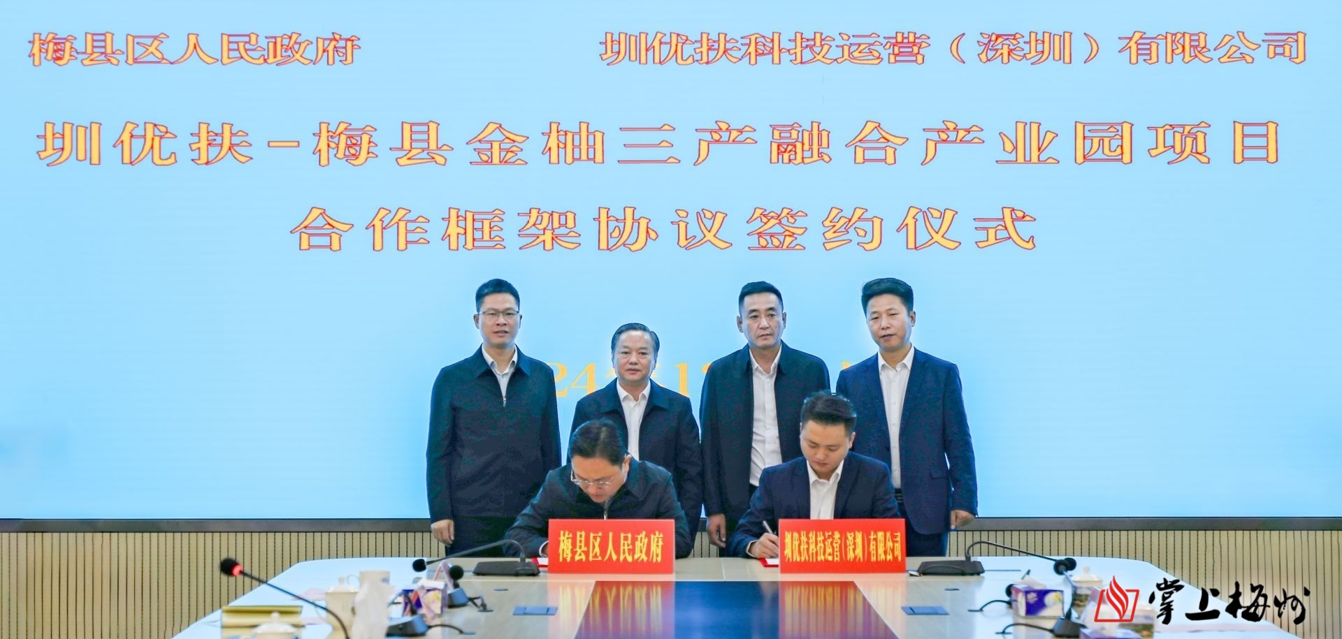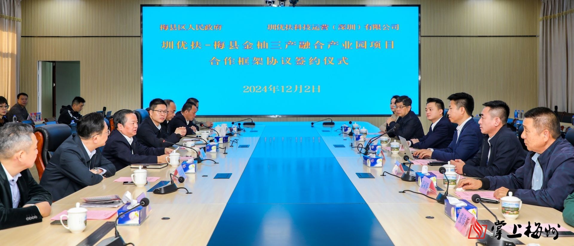 签约仪式上,梅县区副区长王宏基代表梅县区人民政府与圳优扶科技运营(深圳)有限公司董事长何浩杰签订合作框架协议。