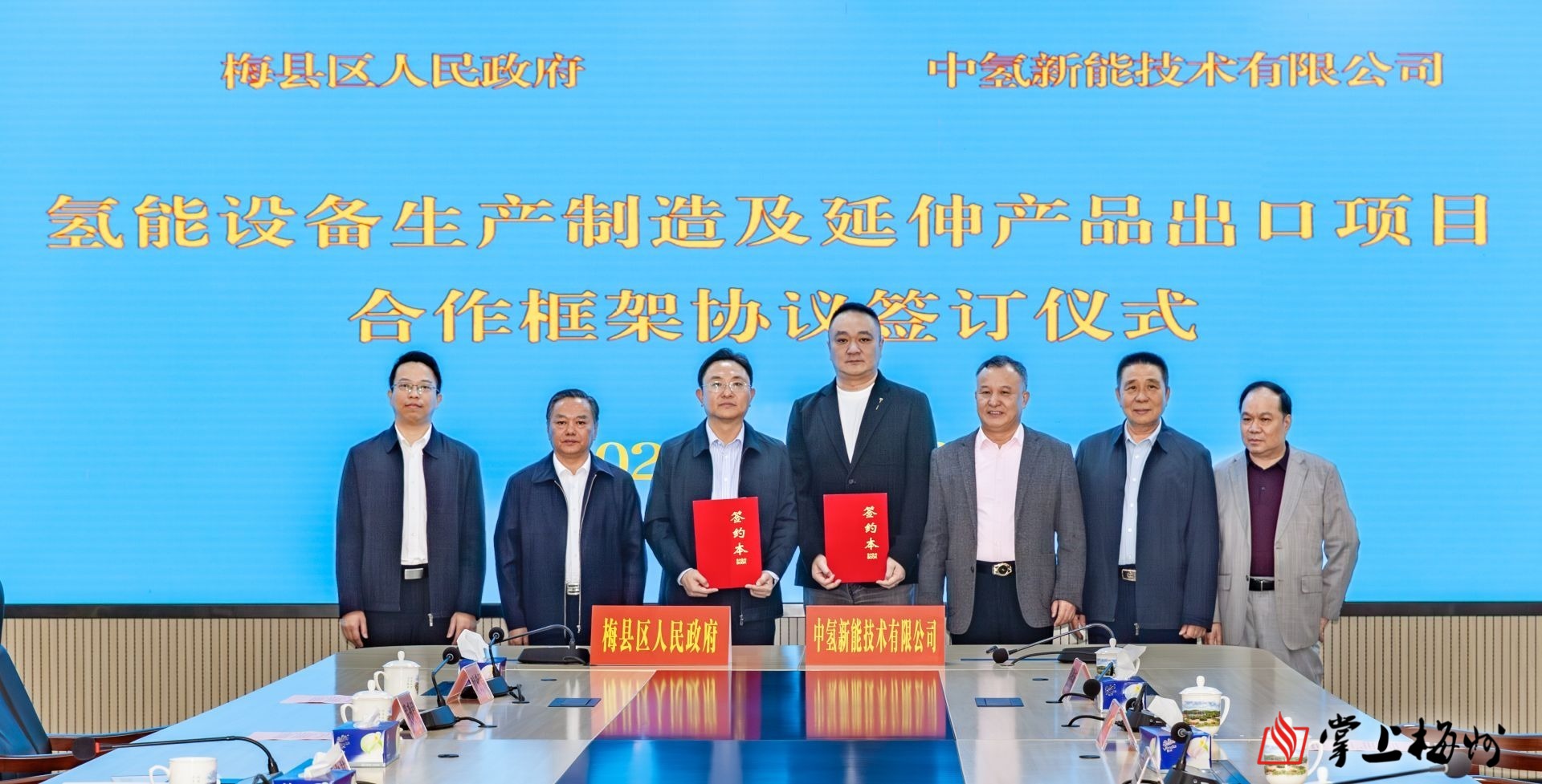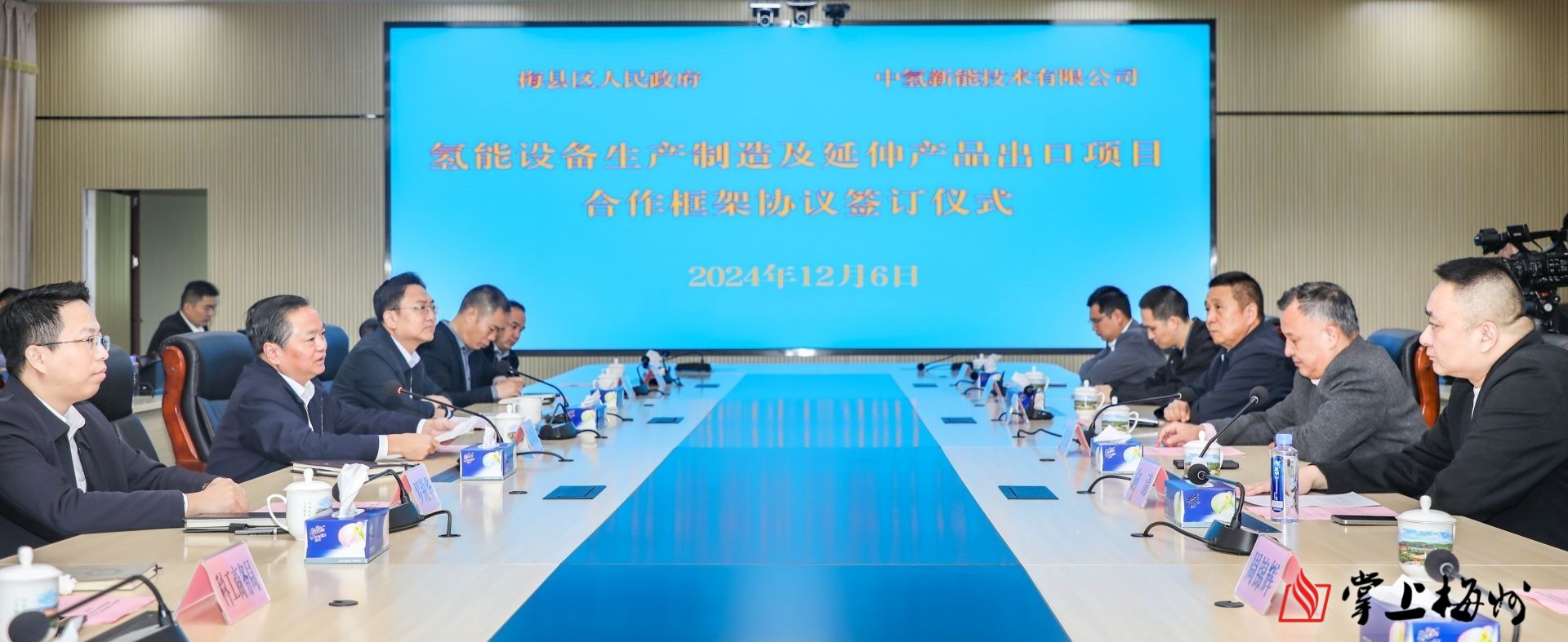 掌上梅州讯 12月6日上午,氢能设备生产制造及延伸产品出口项目合作框架协议签约活动和金柚精深加工产品出口合作框架合同签约活动在智慧梅县政务指挥中心举行。梅县区委书记、梅州综保区管委会党组书记温助民,梅县区副区长王宏基,梅州综保区管委会副主任罗锐华,中氢新能技术有限公司董事长助理、通亿健康科技发展(梅州)有限公司总经理向清,广东睿辉科技创新发展有限公司董事长张其浪,梅州市珍宝金柚实业有限公司董事长温禄腾以及相关企业代表等参加签约活动。