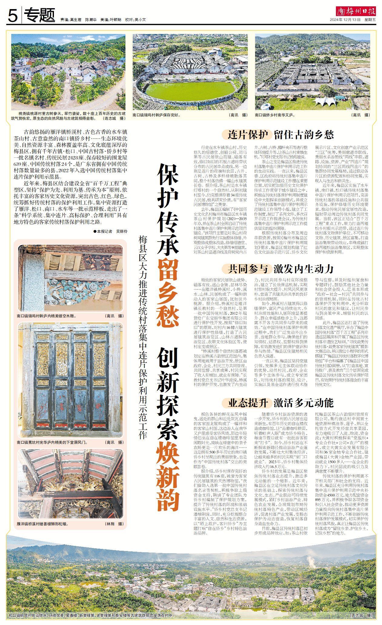 近年来,梅县区结合建设全省“百千万工程”典型区,坚持“保护为先、利用为基、传承为本”原则,依托丰富的客家历史文化资源,突出古色、红色、绿色,统筹抓好传统村落的保护利用工作,集中资源打造了雁洋、松口、南口、水车等一批示范样板,走出了一条“科学系统、集中连片、高标保护、合理利用”具有地方特色的客家传统村落保护利用之路。