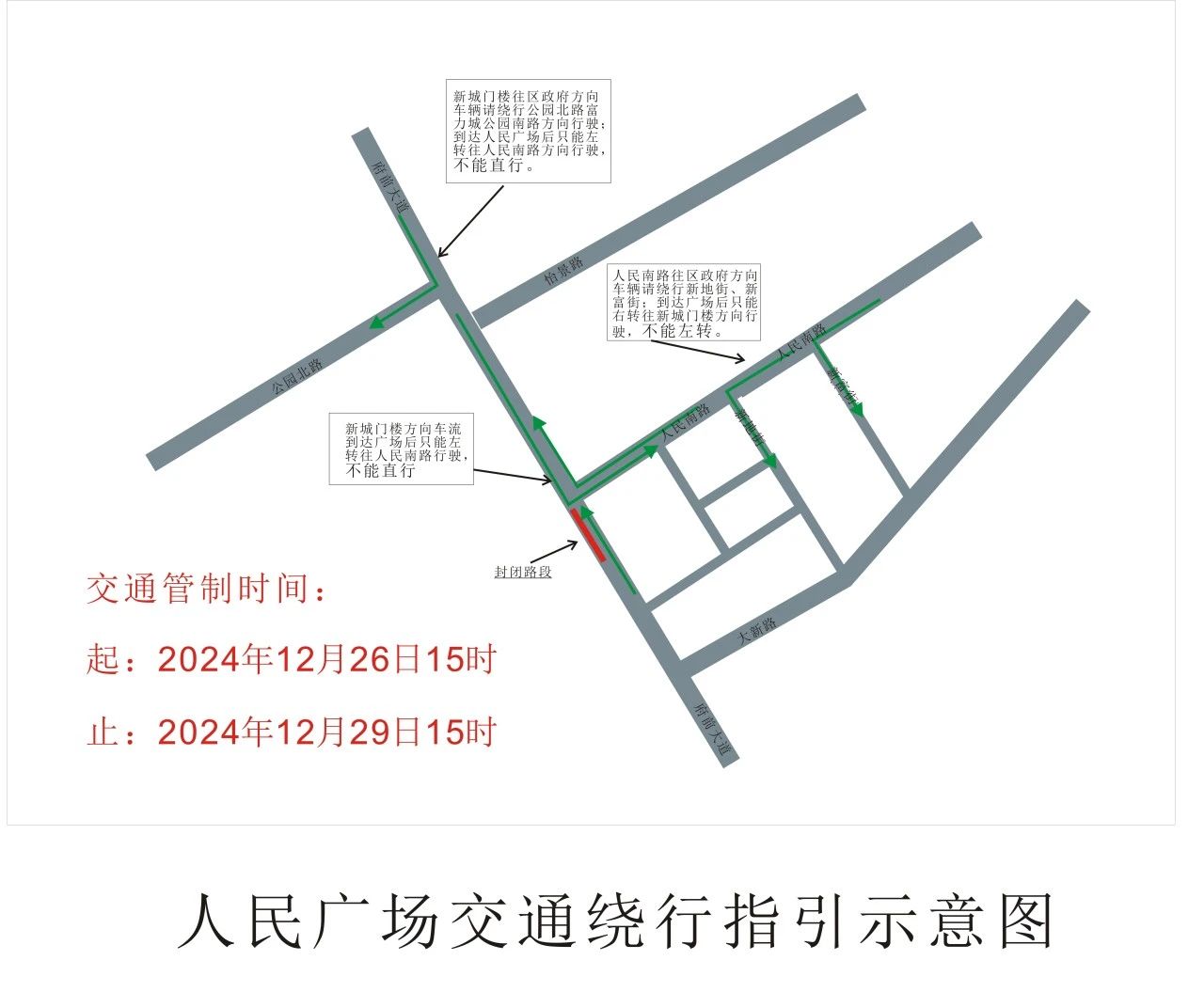 由人民南路方向来的车流,只能右转往公园北方向行驶,不得左转向行政服务中心行驶;