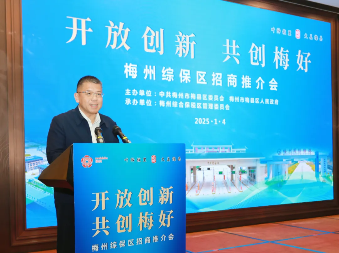 王锋在致辞中表示,当前,梅县区深入学习贯彻党的二十届三中全会以及中央经济工作会议精神,认真落实省委第十三届六次全会暨省委经济工作会议精神,聚焦经济建设这一中心工作和高质量发展这一首要任务,以“百千万工程”为总抓手,狠抓发展第一要务,全面激发内生动力,坚持实体经济为本、制造业当家,依托“一园一区一港”和“反向飞地”等融湾发展平台,发展壮大高端铜箔、机械智造、智能家电“2+1”主导产业,大力培育新材料、新型储能、低空经济、数字经济、人工智能等新兴产业,不断发展壮大县域经济。梅州综保区是广东省首个内陆型综保区、梅州首个国家级对外开放发展平台,且与梅州国际陆港实现区港联动,标准厂房、保税仓库等配套设施齐全,奖补政策优惠,发展空间广阔,进出口规模稳步增长,保税业态逐渐增加,2024年进出口额突破40亿元,增长率在全省综保区中列第二。诚邀企业家前来梅县区、梅州综保区走访考察、投资兴业,梅县区、梅州综保区将提供一流的政策支持、一流的平台支撑、一流的服务环境,让广大企业放心投资、舒心经营、安心发展。