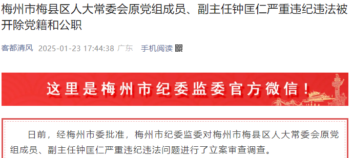 日前,经梅州市委批准,梅州市纪委监委对梅州市梅县区人大常委会原党组成员、副主任钟匡仁严重违纪违法问题进行了立案审查调查。