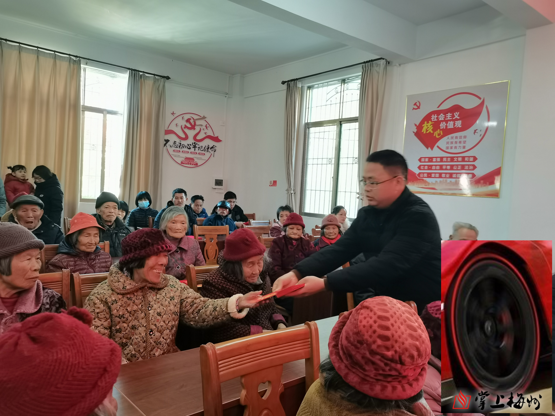 龙凤村村委会李经国为寿星送上慰问金。