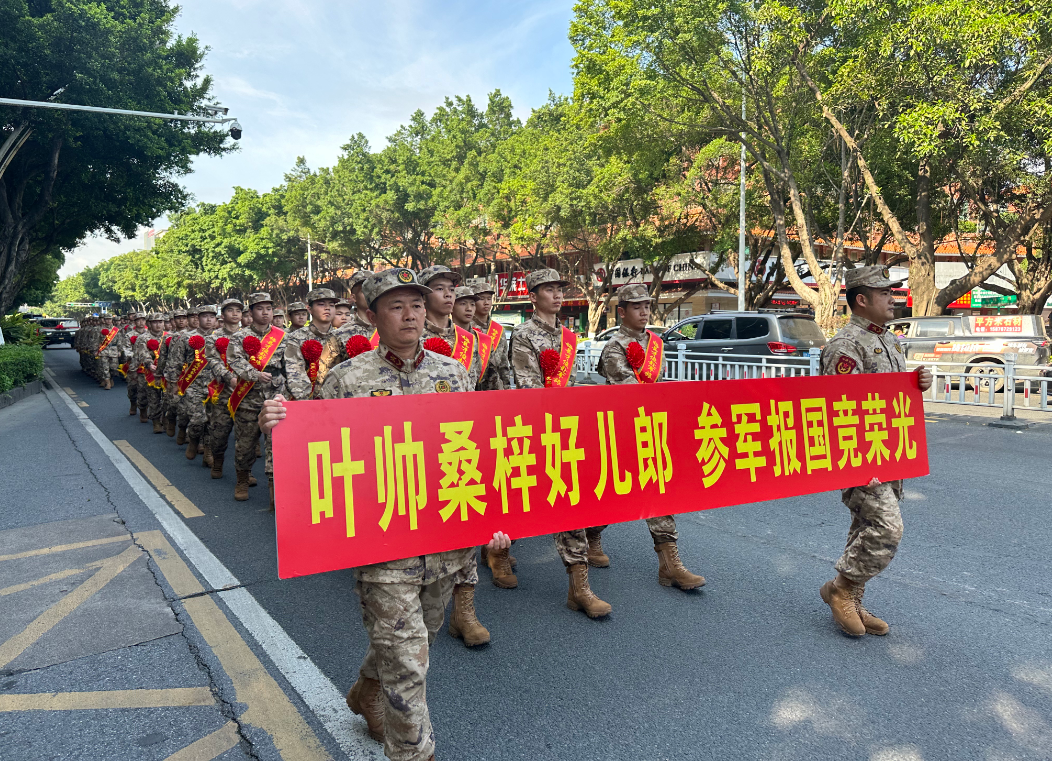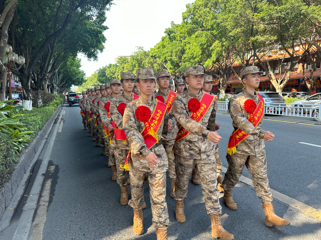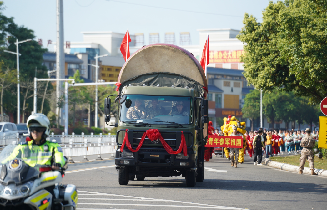 上午8时30分,由铁骑率先开道,锣鼓车、花鼓队、腰鼓队、娘酒队、竹板队组成的客家民俗方阵紧随其后。锣鼓声震天动地,花鼓队舞动红绸,娘酒队身着客家传统服饰手捧酒坛,以醇香米酒致敬新兵,竹板队清脆的击打声与口号声交织,奏响军民同心的乐章。入伍新兵们身着崭新戎装,迈着整齐有力的步伐,喊着响亮的口号,精神抖擞地走在巡游队伍中。他们身姿挺拔、眼神坚定,充分展现了新时代青年投身国防事业的坚定决心和昂扬斗志。嘹亮的歌声、口号声与街道两侧“携笔从戎锤炼男儿本色,建功军营忠诚报效祖国”的红色横幅交相辉映。不少家长眼含热泪追逐队伍,用手机记录下孩子身着戎装的英姿。随后,悬挂着“客都骄子赴军旅 梅州荣光耀军旗”等标语的车队载着入伍新兵们绕城而行,所到之处汽笛长鸣,群众挥手致意,不少人拿出手机拍照留念,记录下这一光荣的时刻。