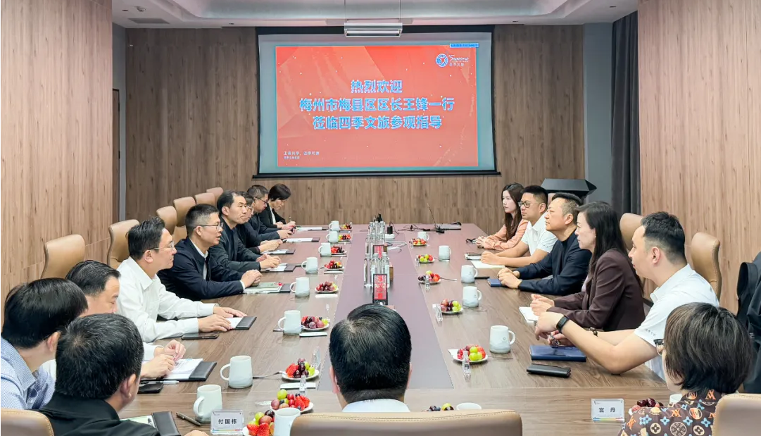 在广东四季文旅控股有限责任公司,王锋与四季文旅董事长金健就梅县文旅资源开发与运营模式创新进行座谈交流,寻求合作共赢路径,共同推动梅县文旅产业高质量发展。