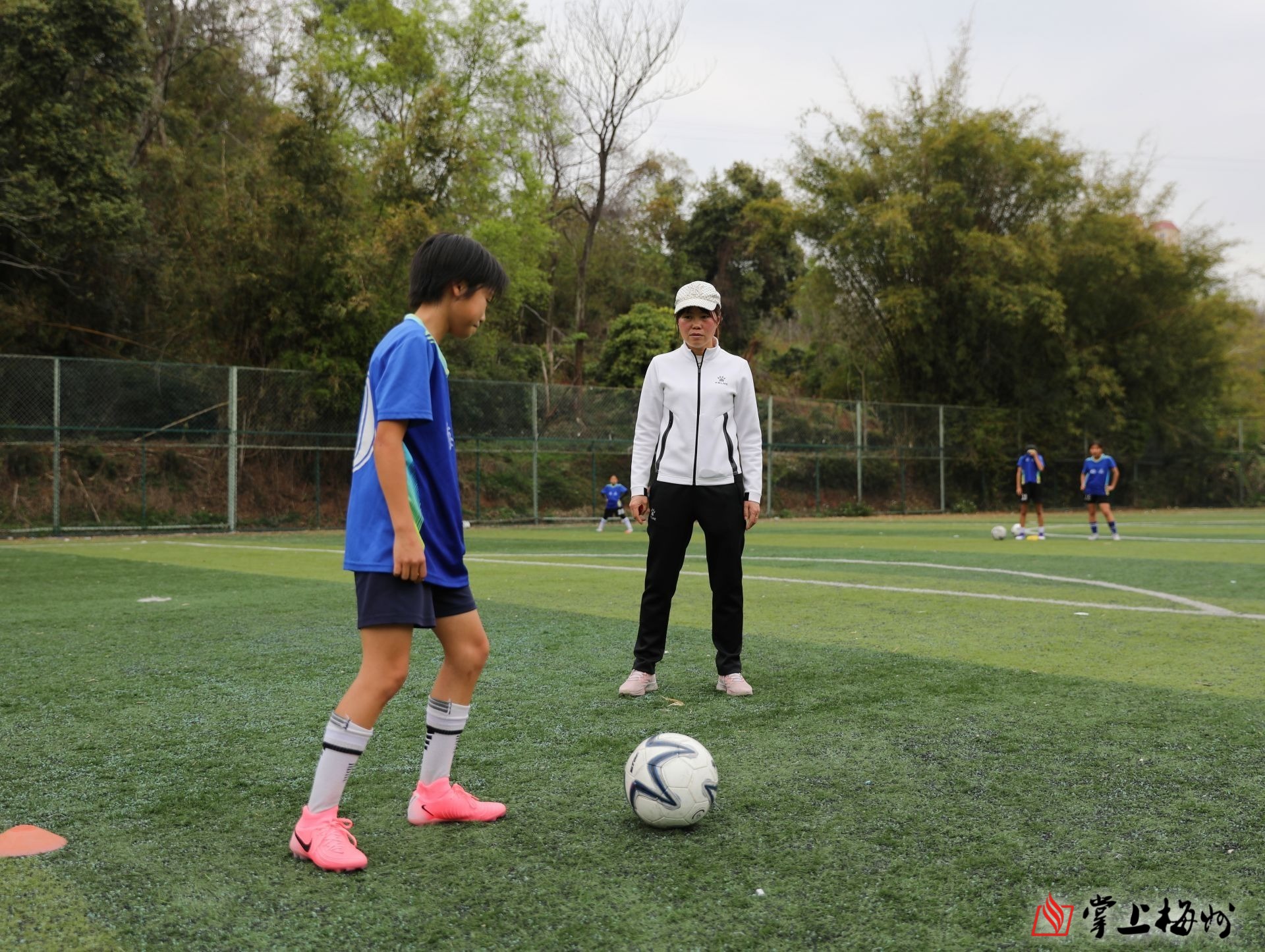 每天下午,叶海苑(右)都会带领女足队员们在绿茵场上训练。