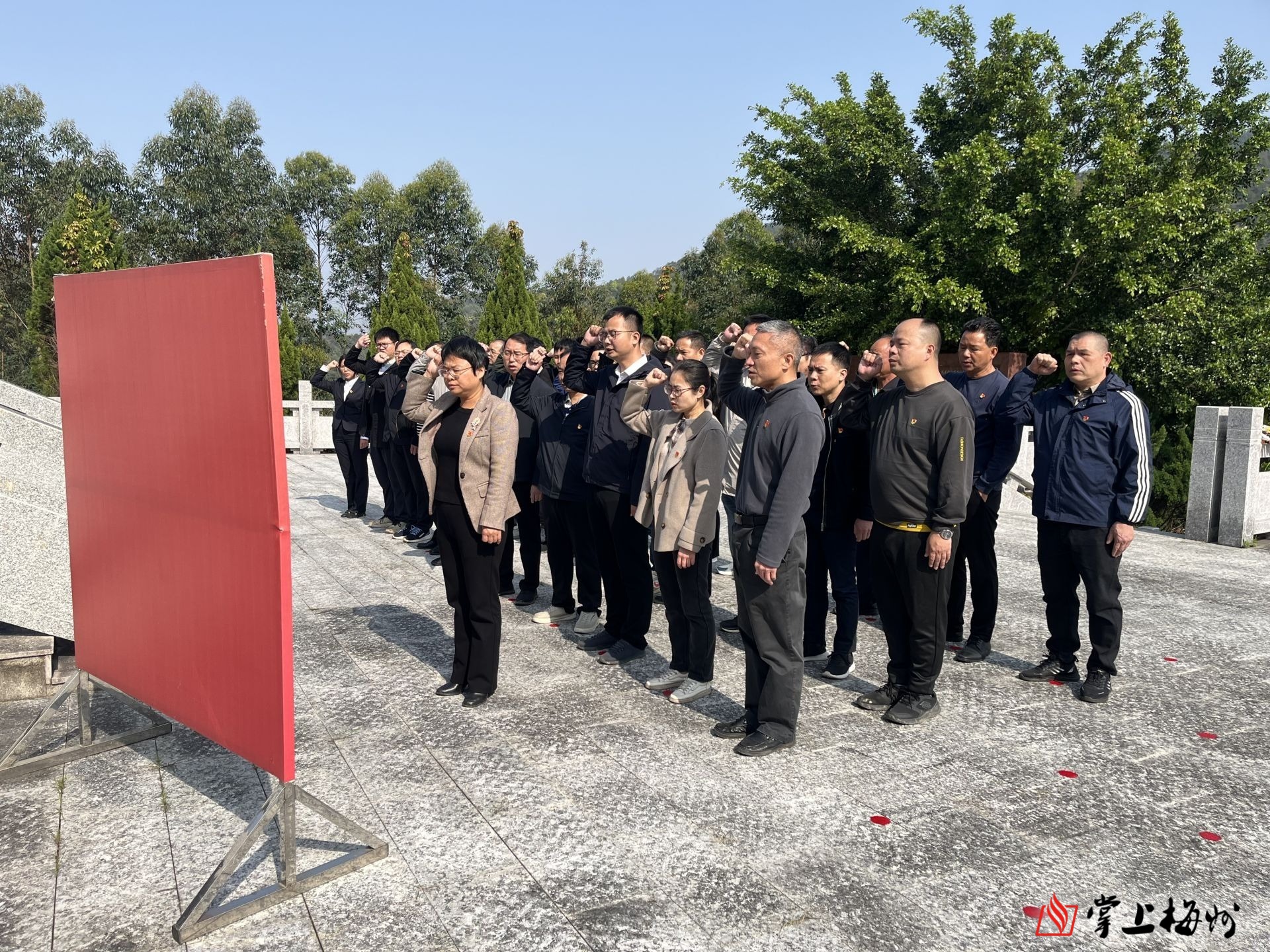 上午9时,祭扫活动在雄壮的国歌声中开始。烈士纪念碑前,全体人员整齐列队,庄严肃立向革命烈士三鞠躬,并默哀一分钟,表达对革命先烈的深切缅怀和崇高敬意。随后,由梅南镇党委书记胡梅清带领大家重温入党誓词,“我志愿加入中国共产党……”在鲜红的党旗前,50余名党员干部重温入党誓词,字字铿锵,掷地有声。紧接着,全体参加活动人员为纪念碑敬献鲜花,并缓步绕行一周,纪念碑上镌刻着的英雄革命事迹无不感动着参加活动的人员,大理石上的烈士名单触动着在场每一位同志的心弦。
