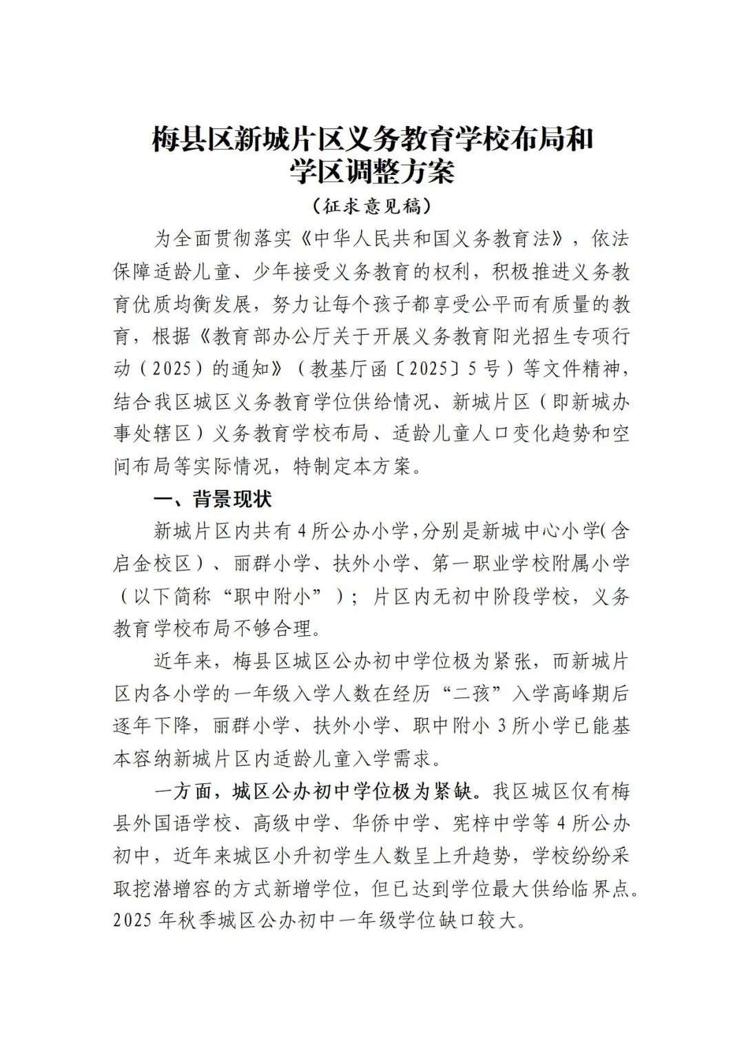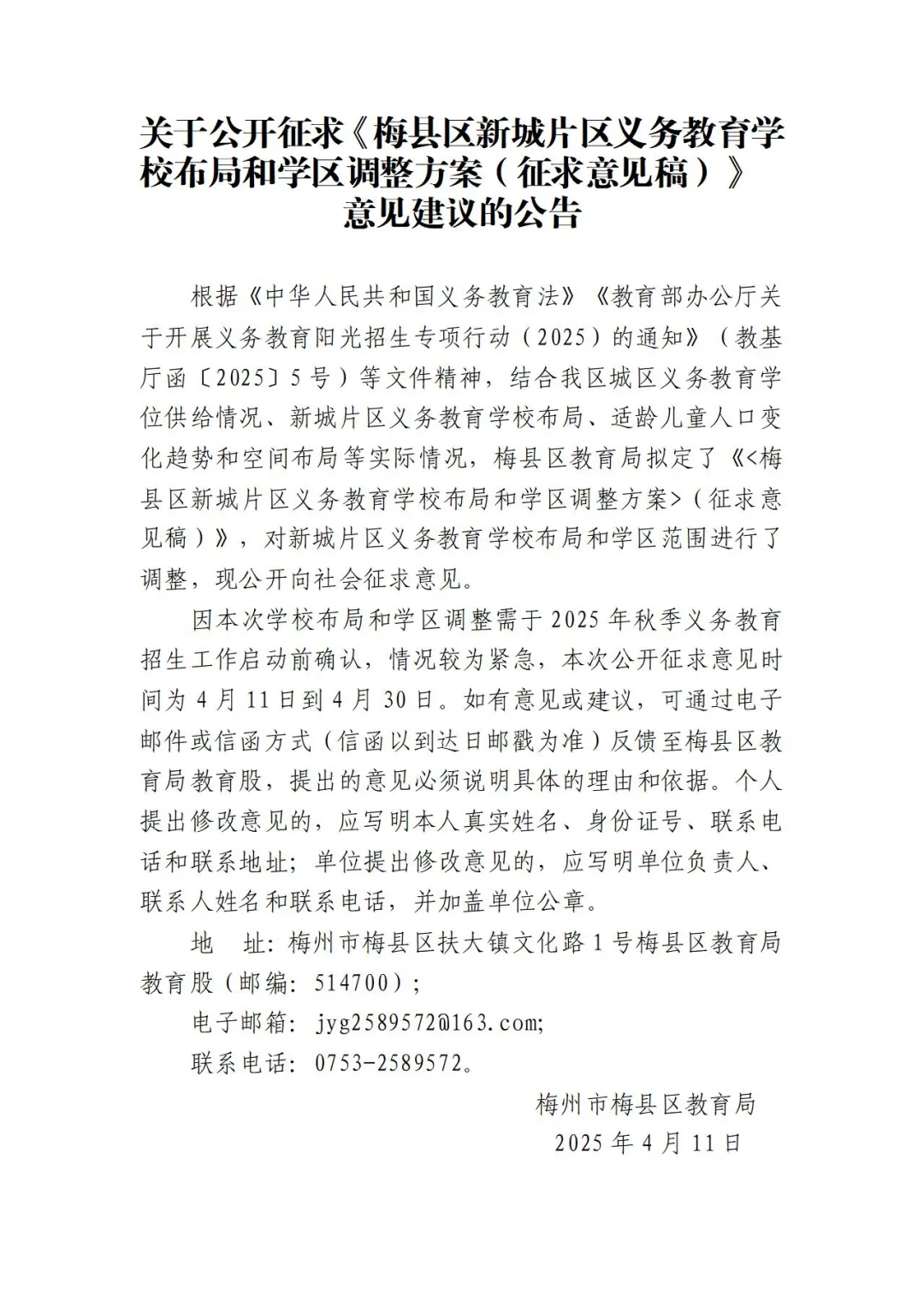 征求意见!梅县区新城中心小学拟停止一年级招生,逐年过渡转办为初级中学 ©原创 2025-04-14 22:30 0 掌上梅州讯 记者从梅县区教育局官网了解到,梅县区教育局发布公开征求《梅县区新城片区义务教育学校布局和学区调整方案(征求意见稿)》意见建议的公告。公告详情如下: 、 梅州日报记者:吴丽伶 编辑:罗欢欢 审核:蔡颜颜