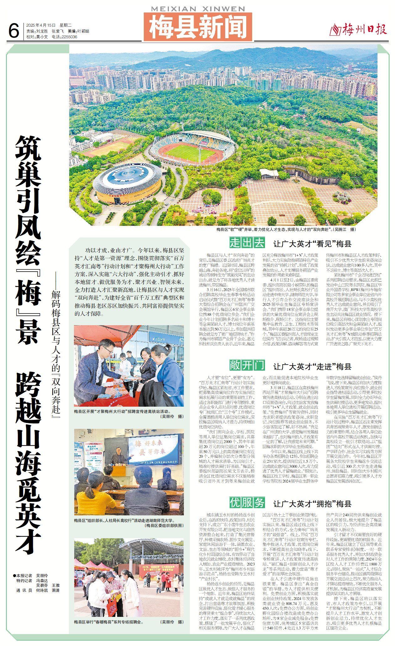 功以才成,业由才广。今年以来,梅县区坚持“人才是第一资源”理念,围绕贯彻落实“百万英才汇南粤”行动计划和“才聚梅州大行动”工作方案,深入实施“六大行动”,强化主动引才、抓好本地留才、做优服务为才,聚才兴业、智领未来,全力打造人才汇聚新高地,让梅县区与人才实现“双向奔赴”,为建好全省“百千万工程”典型区和推动梅县老区苏区加快振兴、共同富裕提供坚实的人才保障。‘’