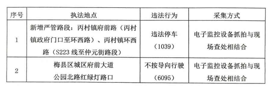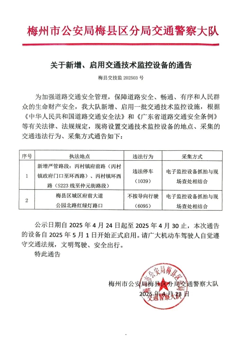 为加强道路交通安全管理,保障道路安全、畅通、有序和人民群众的生命财产安全,梅州市公安局梅县区分局交通警察大队新增、启用一批交通技术监控设施,根据《中华人民共和国道路交通安全法》和《广东省道路交通安全条例》等有关法律、法规规定,现将设置交通技术监控设备的地点、采集的交通违法行为、采集方式通告如下: