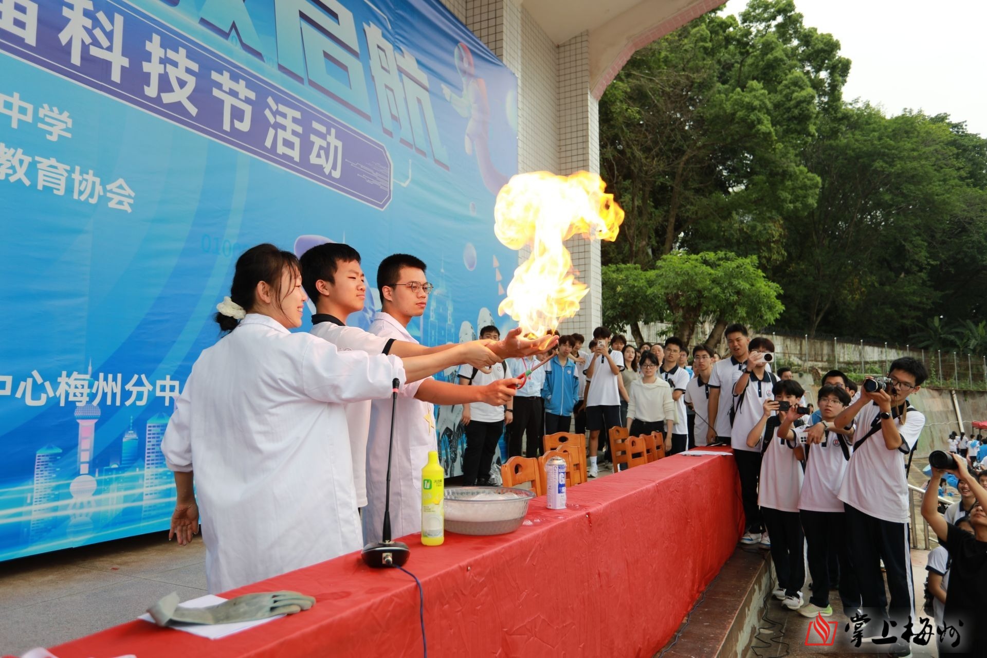 在科学实验环节,梅州市青少年科技教育协会科普实践指导老师带来的“化学魔法秀”,演示了“大象牙膏”“法老之蛇”等趣味实验,利用化学反应产生的奇妙现象,吸引学生注意力,激发他们对化学的兴趣;同时还带来“力学奇幻秀”,通过“空气炮”“气球摩天轮”等实验,展示力学原理在生活中的有趣应用,引导学生思考物理知识的实际价值。“我体验了一下‘火焰掌’,感觉真是太神奇了,激发了我对科学世界的求知欲。”学生洪易说。