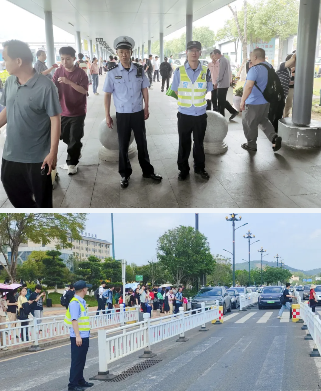 交警大队全员上岗,在城西高速口、高铁西站、景区周边等车流密集路段疏导交通,严查违法,排查隐患,用荧光绿点亮平安旅途。
