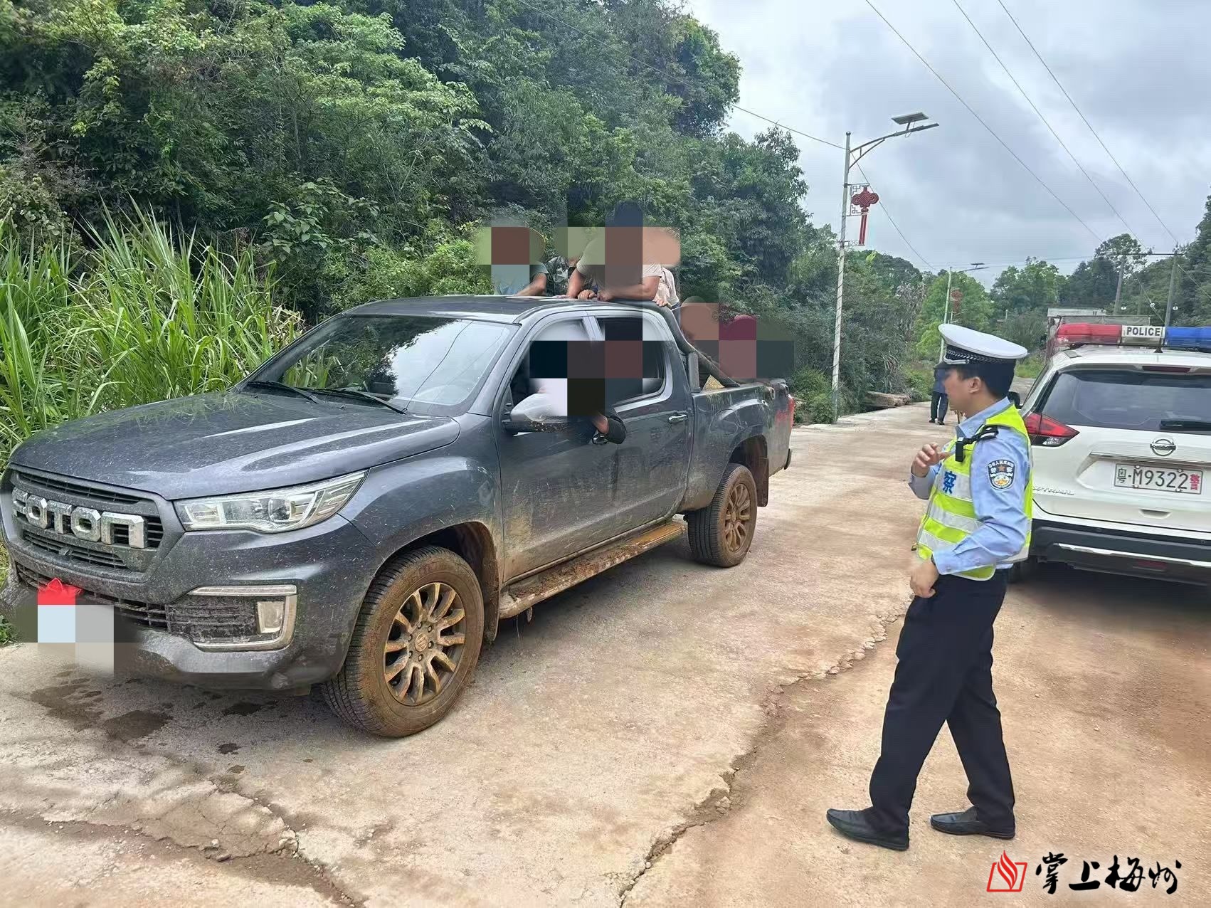 ▲该货车核载5人,实载16人,其中有10名人员站在货厢上。(梅县交警供图)